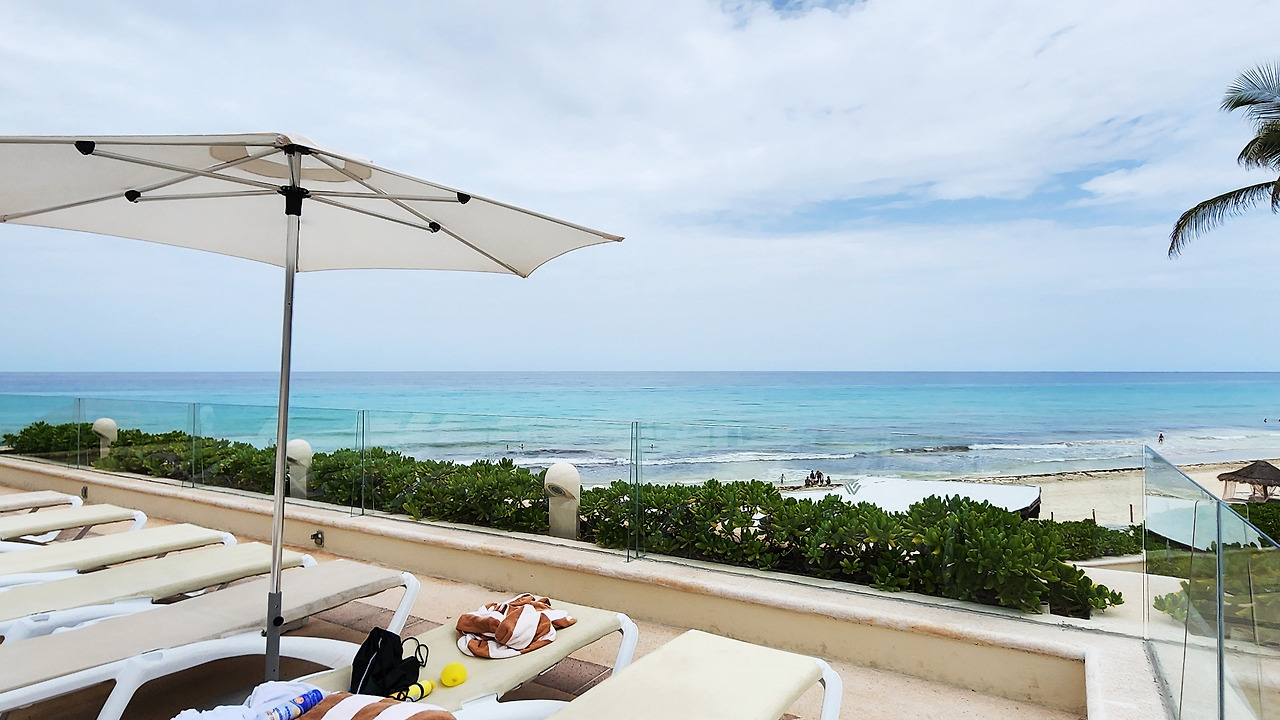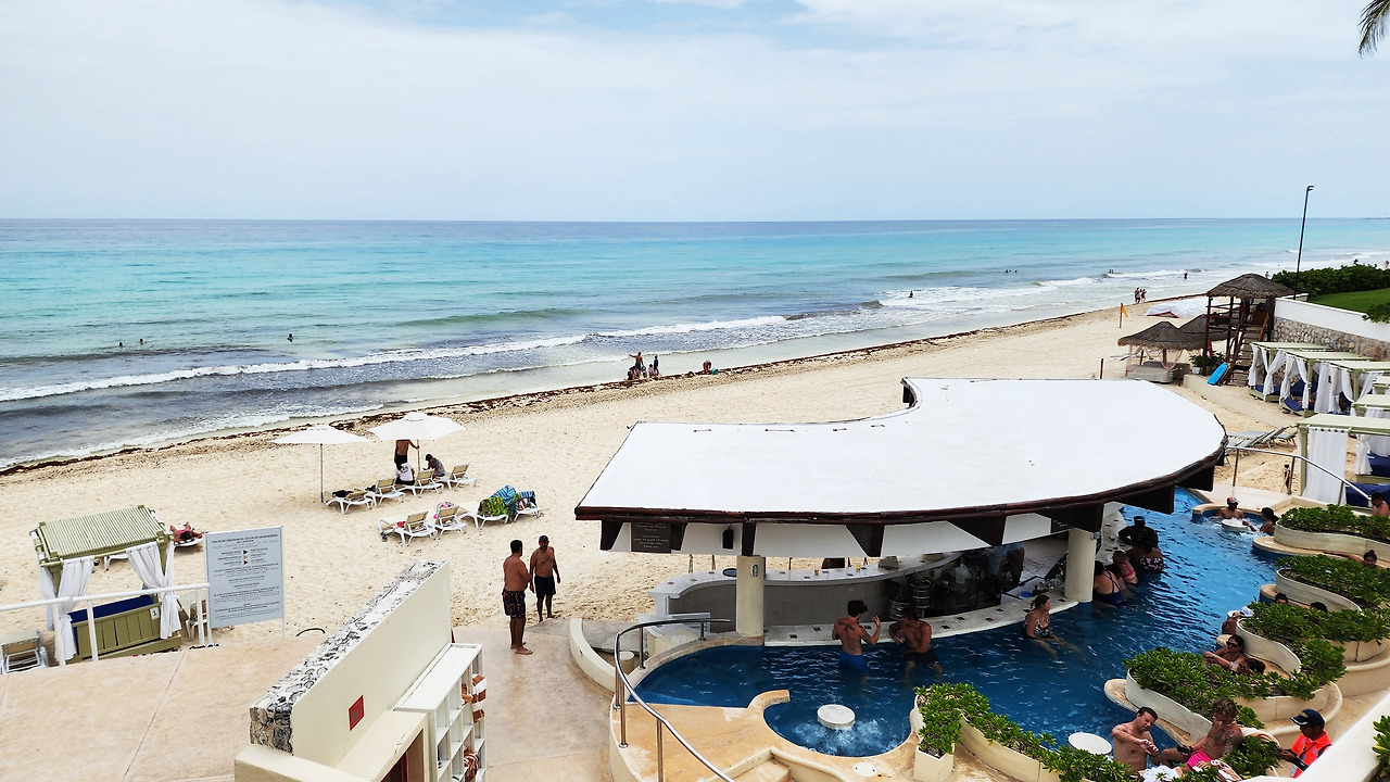 너무 뜨겁고 습한 우기의 칸쿤 바다. 낮에 선베드에 누울 수가 없다. 다들 수영장에서만...
