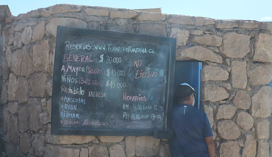 온천 입장료 안내판(일반 3,000페소, 60세 이상과 어린이 15,000페소)