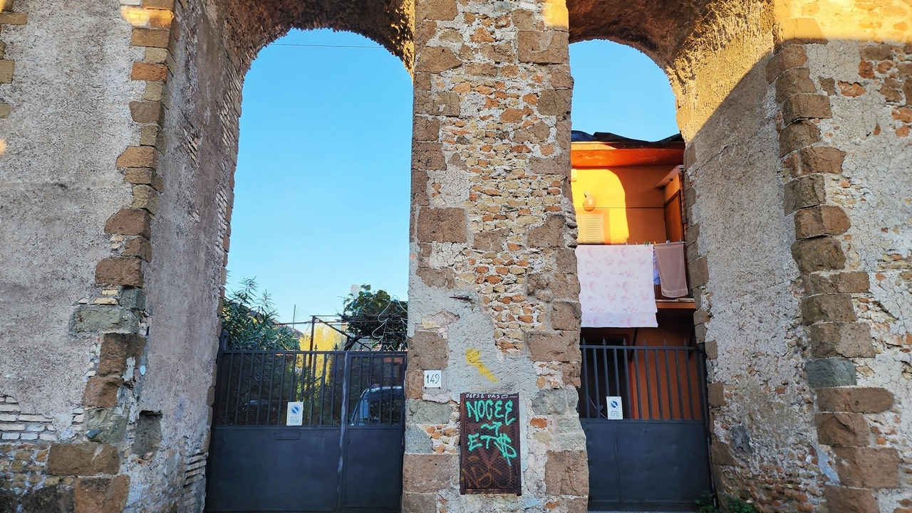 유적과 한 몸으로 살아가는 로마인. 수도교가 누군가의 집 담벼락으로...