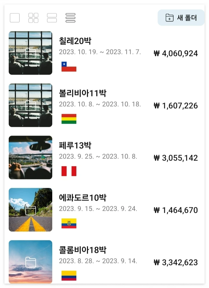 여행가계부 트라비포켓의 여행 폴더별 기록