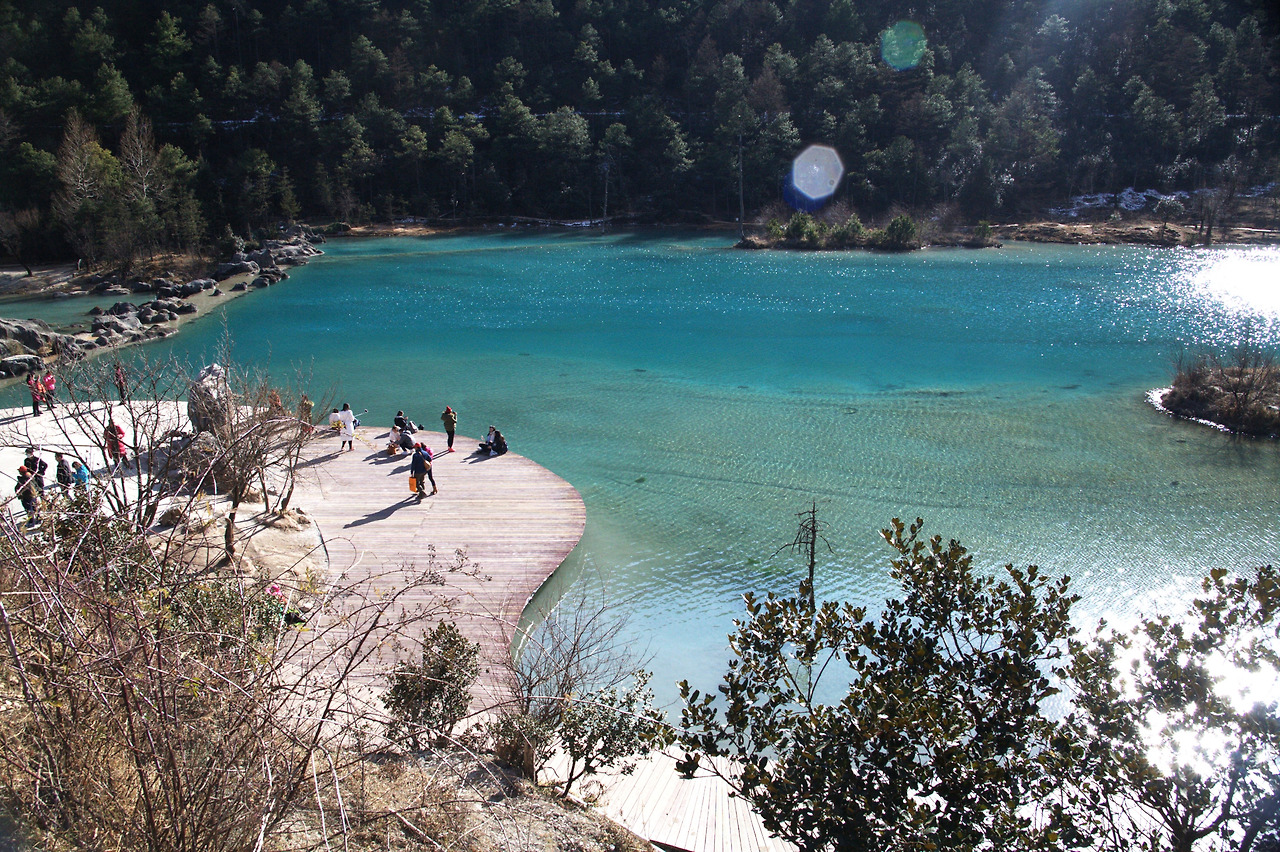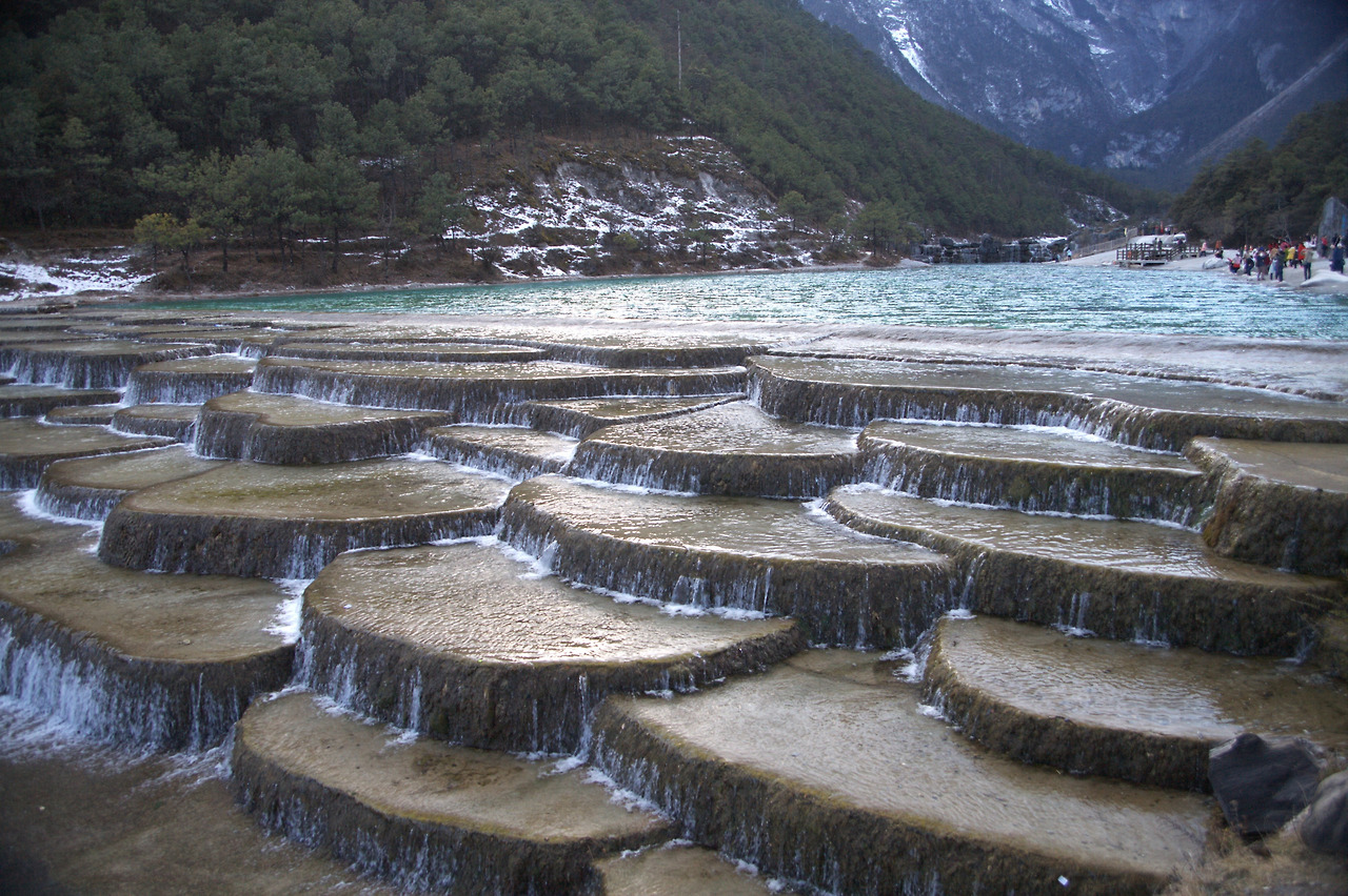 내려오는 길에 백수하(白水河[báishuǐhé]바이수이허=람월곡(蓝月谷[lányuègǔ]란위에구)에 들렀다. 백수하는 석회암의 카르스트 지형이 만든 층층 연못과 그 아래 호수로 이루어져 있었다. 한마디로 구채구(九寨沟[Jiǔzhàigō])와 황룡(黄龙[Huánglóng])을 섞어 만든 ‘미니 구채구와 미니 황룡의 조합’이었다. 석회질 계단형 계곡은 황룡을 빼닮았고 호수의 물빛은 구채구를 연상시켰다.