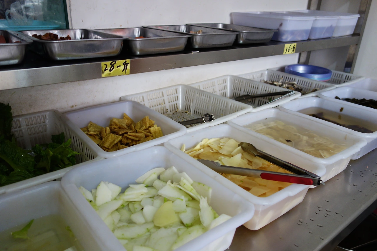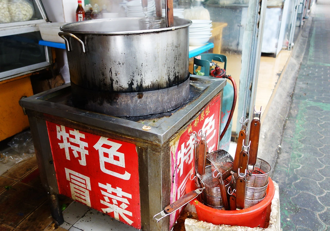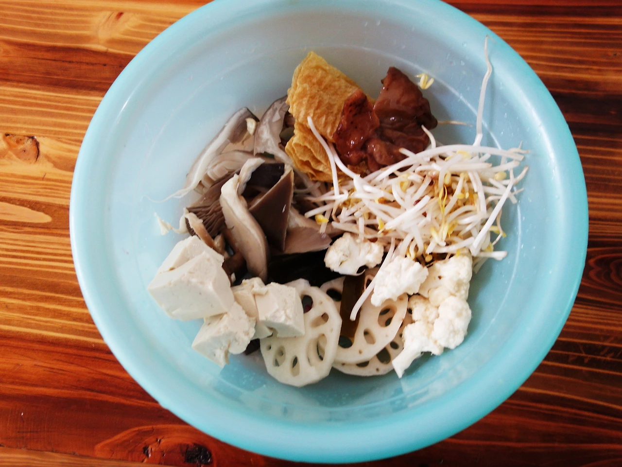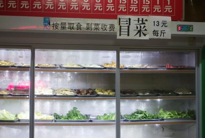 마오차이 식당에 들어서니 빈 양푼이 하나를 내어준다. 눈치를 보니 여기에 원하는 재료를 담으라는 뜻. 각종 식재료가 진열된 곳으로 가니. 야채와 고기, 두부피 등 온갖 재료들이 간택을 기다리고 있었다. 내가 양푼이에 담은 것은 느타리버섯, 목이버섯, 브로콜리, 숙주, 얇게 썬 감자, 연근, 배추, 다시마, 두부였고 저울에 달아 값을 매겼다. 이렇게 골라 담은 재료는 육수가 펄펄 끓는 큰 솥으로 '그대로 입수‘되고 망으로 건져 올려진 후 양푼이에 다시 담겨졌다. 여기에 육수와 각종 양념이 끼얹어져 나왔다.