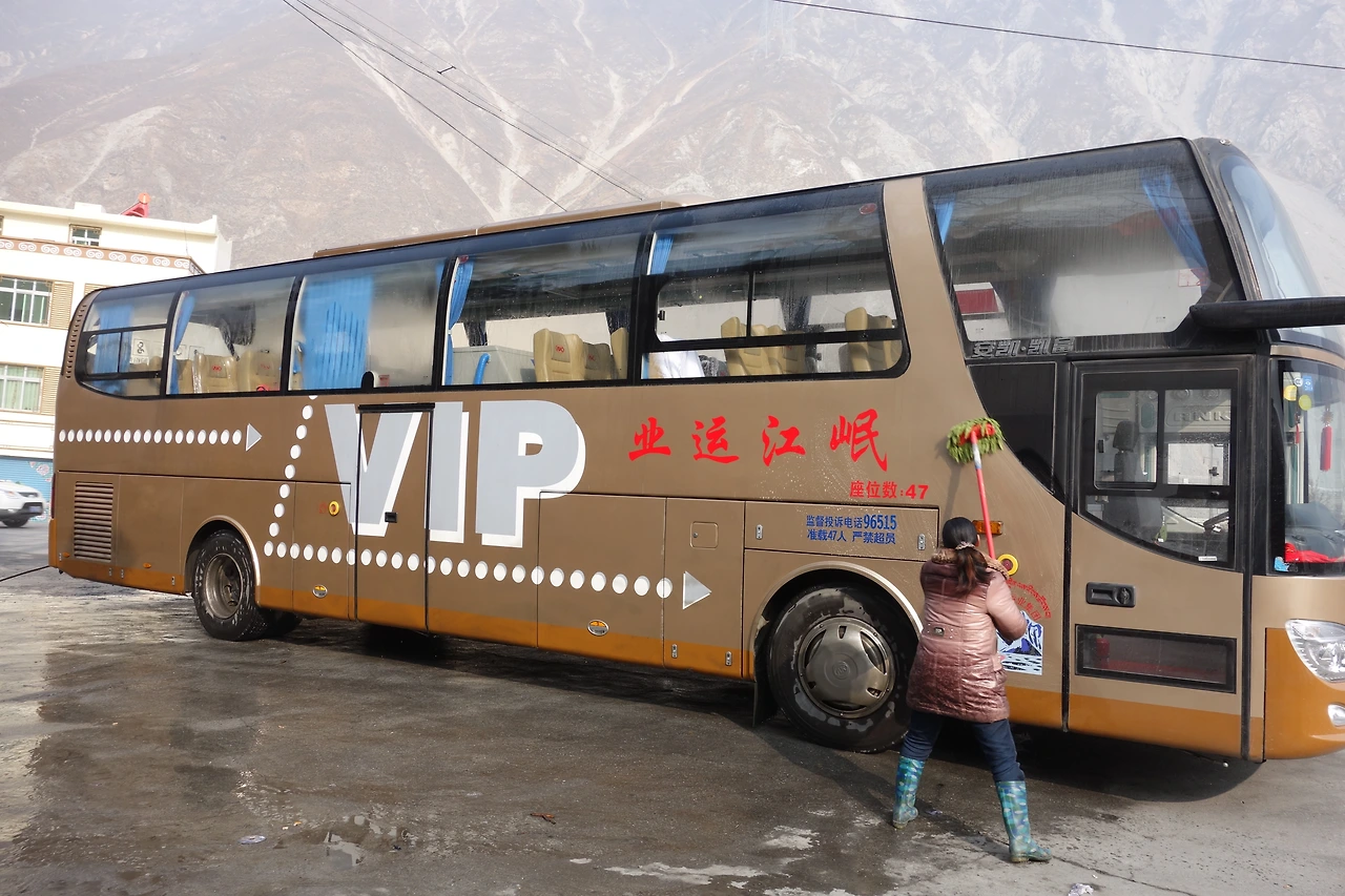 청두에서 구채구(지우자이고우) 가는 버스. 휴게소에서 세차 서비스를 받는다. ⓒ위트립