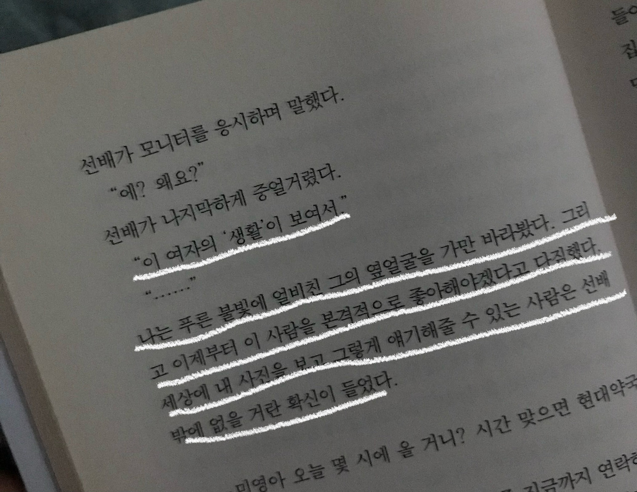 개중 가장 미식이라 평가할 만한 소설으로는, '물속 골리앗'을 꼽을 수 있겠다. "장마는 지속되고, 수박은 맛없어진다."는 아름다운 문장이 등장하는 단편이기도 하다. 어딘가에서 지나가듯 들어보았던 이 문장을 실제로 목격하자마자 흥분해서 사진을 몇 장이고 찍은 기억이 생생하다. 읽으면서는 한순간도 긴장을 늦추지 못하고 주인공의 행적을 바삐 따라갔는데, <비행운> 안에서 가장 비극적인 소설이다. 그런 소설과 진득하게 엮이다 보니 나중에는 힘이 다 빠져 다음 단편을 읽지 못할 지경이었다. 고립, 상실, 결핍을 모두 가진 최악의 최일선 끝에 선 아이가 살아남기 위해 헤엄치는 아름다움을 간직한 이야기는, 읽는 내내 그의 생존을 간곡히 바라게 되면서도 한편으로는 그 결말이 비극에 이를 것 같다는 위태로움 속에 끝을 맺고 만다. 단편 소설의 짧은 서사와 플롯 안에서 김애란의 유려한 문체는 정점에 다다른다. 누군가는 실험적이라 느낄 수 있을 정도로 묘사가 가득한 소설이지만, 과하다는 생각이 들지 않게 담백하게 서술했다. 더불어 절망과 희망이라는 양가적 감정을 이렇게 단순하게 표현할 수 있다니! 그 깊이에 경탄을 표한다.