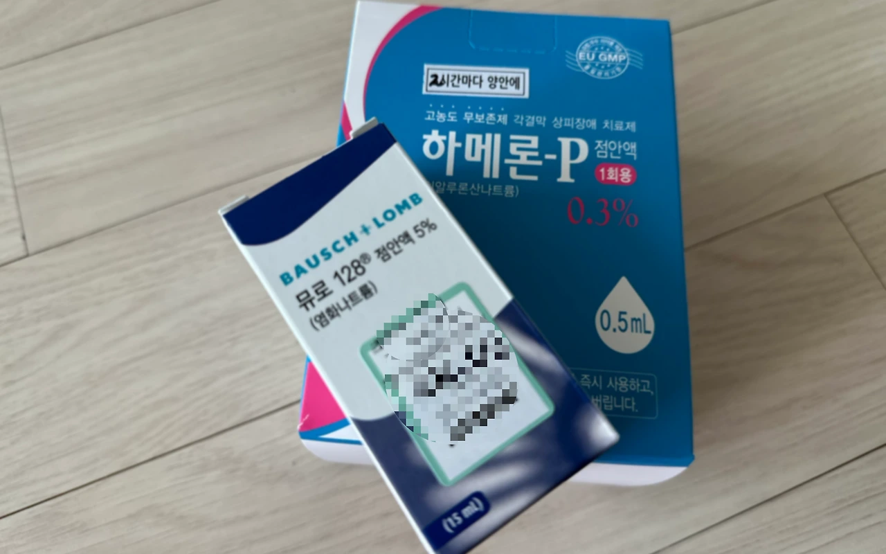 2시간 마다 점안액을 투여하고, 그 중 2번에 한번 정도씩은 고삼투 점안액도 병용하고 있다. 뮤로128 5% (Muro 128 5%) 이라는 점안액이다.
