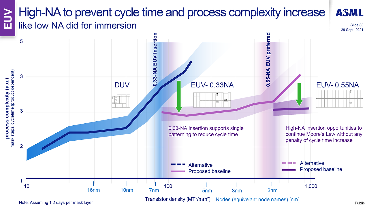 0.33 NA보다 Throughput은 떨어지지만, 해상도가 높아져 2nm 이하의 파운드리 공정에서 Process Complexity (Mask layer 수를 포함한)를 낮춰주어 성능/수율 확보에 유리해집니다.