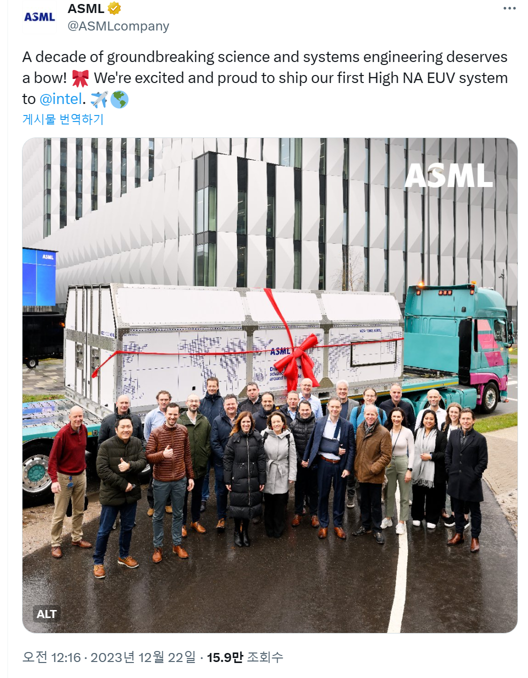 파운드리 업계의 게임 체인저라고도 얘기되고 있는 네덜란드의 ASML社 High NA EUV 설비가 Intel로 12/22 납품되었습니다.