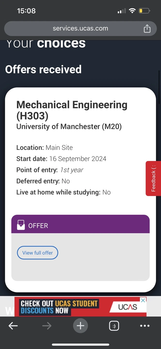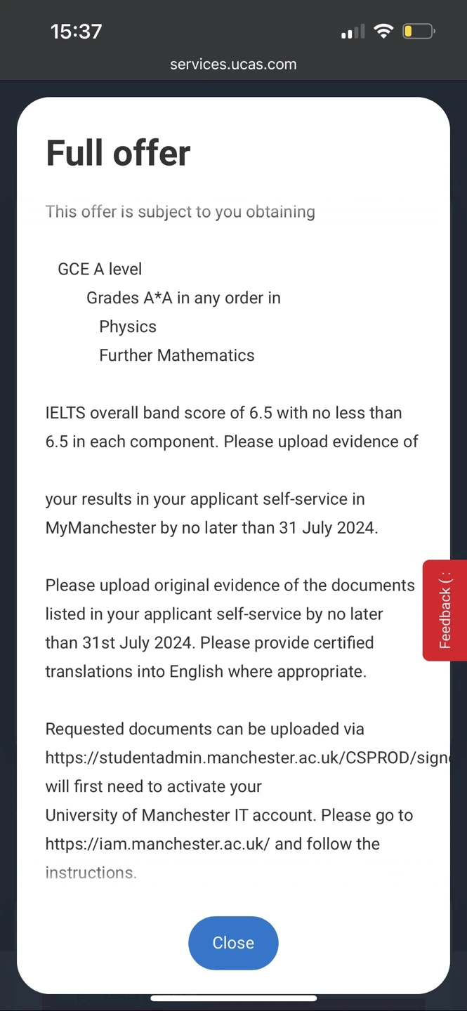 10월 16일 날 지원했는데 오늘 오퍼가 왔으니 2주도 채 되지 않은 시간이다. 작년에는 Bristol 대학으로부터 11월 7일 날 오퍼를 받았는데 그것보다 10일 정도 더 빨리 오퍼를 받은 셈이다. 작년에 오퍼를 받았지만 Manchester 대학을 firm이나 Insurance로 지정하지 않아 혹시나 올해 받아 주지 않을까 봐 다시 지원해도 되냐는 메일을 보낸 게 엊그제인데, 이렇게 빨리 오퍼를 주니 무척 안심이 되었다.