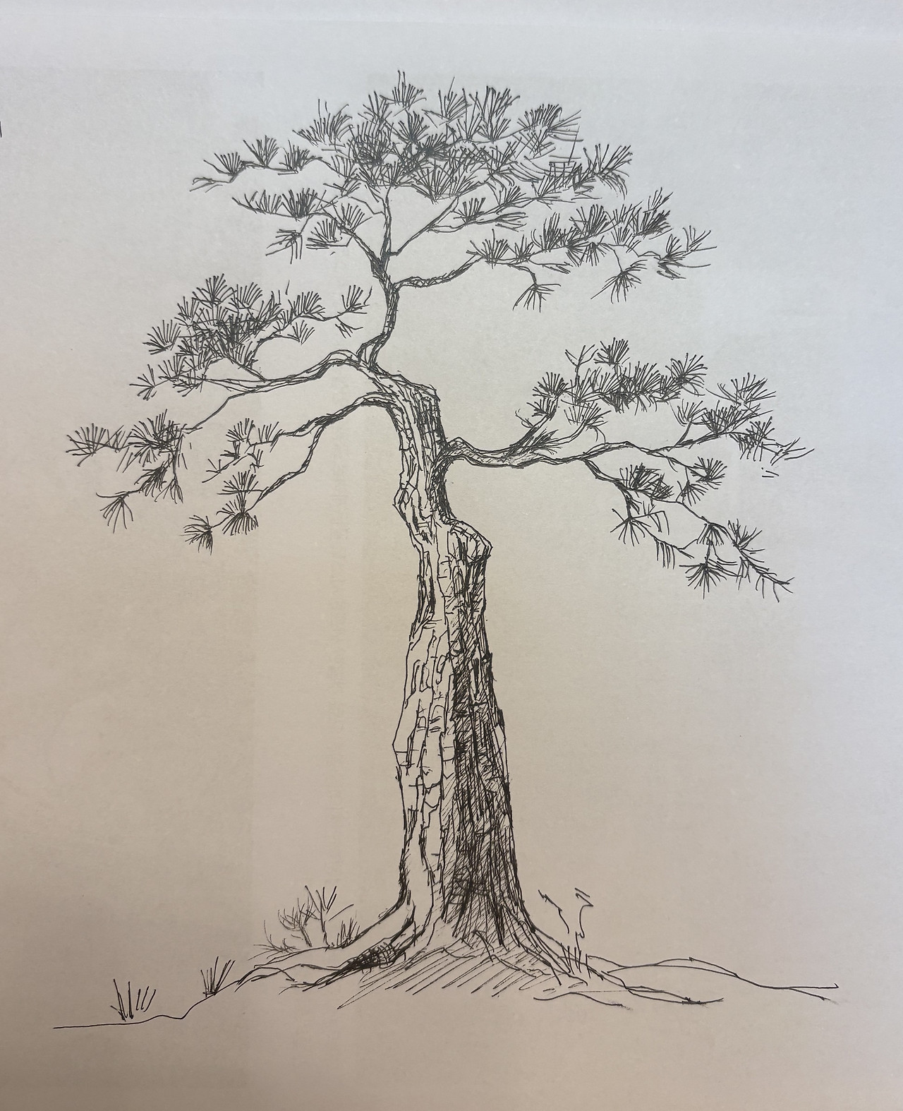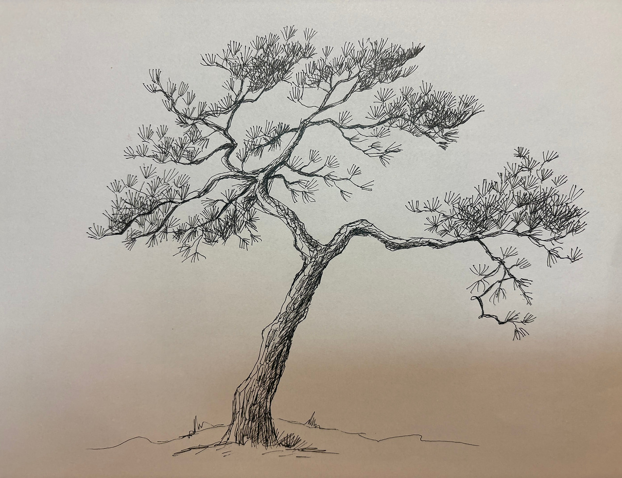 소나무 잎은 손바닥을 쫙 펼친듯한 모습인데 부채꼴 모양으로 그리면 예쁘고 편하게 그릴 수 있다. 잎이 너무 가지런하지 않게 삐쭉삐쭉 규칙 없이 그려야 자연스럽다. 솔잎의 방향도 한 방향으로 그리지 말고 똑같은 길이로도 그리지 않아야 한다. 솔잎 표현을 위해 선을 긋는데 쉬워 보여도 막상 그려보니 뭔가 어색함이 눈에 잘 띄어 더욱 조심스럽다. 초보 실력이 한눈에 드러나는 것 같아 감추고 싶은데 종이 위에 그어버린 선을 다시 주워 담을 방법이 없다. 잘 그리는 분들은 그냥 선을 그어도 포스가 느껴지는데 내 선은 그냥 쭉그은 선같아 거슬린다. 얼마나 많은 선을 그어야 할까?