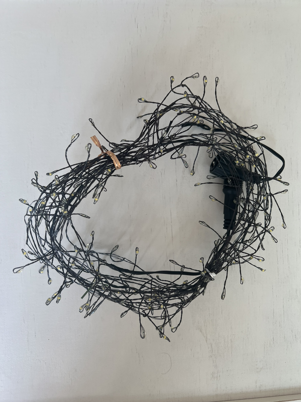 나무가 준비되면 오너먼트보다 전구를 먼저 감아야 한다. 똬리를 틀듯 잘 감아 놓아도 작은 전구들이 서로 엉켜있기 때문에 일자로 푸는데 시간이 좀 걸린다. 준비된 전구 뭉치 개수에 맞추어 트리를 나눠 감아야 나중에 모자라거나 남지 않는다. 원래는 전구 한두 뭉치만 사려고 했는데 사장님이 적어도 3개는 감아줘야 이쁘다고 해서 추천해주는 대로 샀다. 듬성듬성 감다 보니 전구 한 다발로도 나무 하나를 다 감을 수 있어서 속았나 했는데 남은 전구를 2중 3중으로 더 감으니 한번 감았을 때 보다 더 밝은 빛을 내며 화사해 보이는 것이 역시 전문가의 눈이 다르긴 한가보다. 그런데 작년에 이렇게 감았다가 나중에 철수할 때 서로 엉켜서 겆어내는데 시간이 너무 오래 걸려서 전구 다발 3개를 나무에 3등분 한 후 위에서 부터 하나씩 차례로 휘휘 감아 내려왔다. 나무 사이사이 빈틈없이 잘 감으려고 신경 쓰지 않아도 불을 켜면 나무 전체를 환하게 밝혀줘서 전구 감기의 어설픔은 시야에 들어오지 않는다.