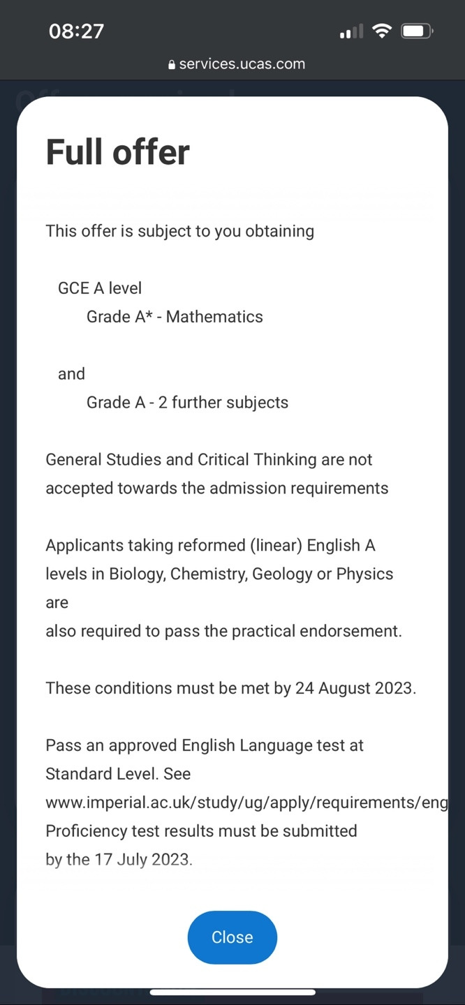 입학에 필요한 A level 성적은 A*AA로 높지 않아 다행이다. 수학에서 A*, 다른 두 과목에서 A를 받으면 된다. 임페리얼에서 필요로 하는 영어성적은 standard, higher level 두 가지가 있는데 design engineering 과에서는 standard level이 요구된다. IELTS 성적으로 보면 6.5 overall(minimum 6.0 in all elements)이다. GCSE를 했으면 영어 성적이 있을 텐데 아이는 GCSE를 하지 않고 바로 A level을 시작해서 영어는 따로 IELTS 시험을 봐야 하는 상황이다. 7월 17일 전까지 성적표를 제출해야 한다.