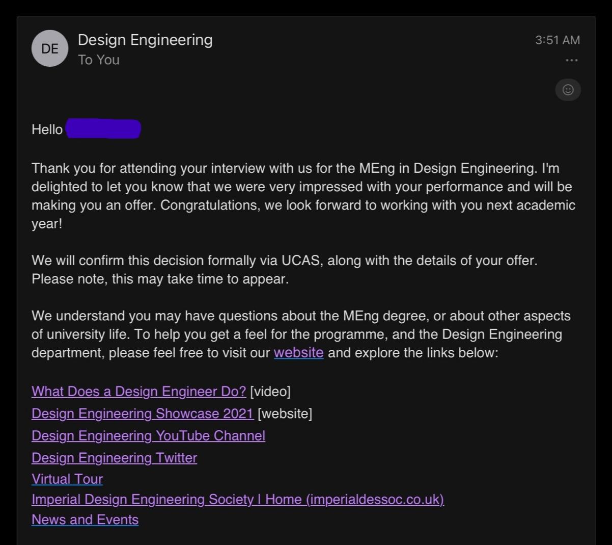 작년 12월에 인터뷰를 한 뒤, 면접관이 3월에 오퍼를 주겠다고 했는데 진짜 3월에 오퍼 메일이 왔다. 인터뷰 때 떨지 않고 하고 싶은 말 대부분 한 것 같다고 해서 큰 걱정은 안 했지만 막상 3월이 되었는데도 오퍼가 오지 않아 노심초사했었다. 엔지니어링과 디자인을 동시에 할 수 있는 학교가 많지는 않아 임페리얼이 1순위 였는데 제일 가고 싶었던 학교에서 오퍼가 오니 다른 학교에서 받은 오퍼와는 비교할 수 없을 정도로 기쁘다. 아직 마지막 관문이 남아있긴 하지만 인생 처음으로 큰 도전을 하였고 일단 성공을 한 것에 큰 의미가 있을 것 같다. 이제 시작이고 앞으로 이런 도전이 끝없이 이어질 것이다.