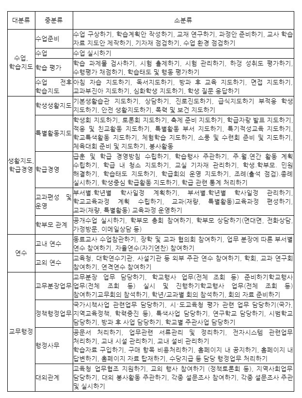 교직에서 10년 넘게 있다 보니 세부 항목 하나하나가 어떤 업무인지 머릿속에서 구체적으로 떠오르면서 숨이 턱 막혔다. 영역에서 정도의 차이가 있을 뿐 대부분의 교사는 학교 현장에서 위의 업무를 모두 하고 있다. 저 많은 업무량을 소화해야 하니 교육의 질을 제고하기 위한 여력이 없다. 교육 현장에서 학생과 가장 가까이 있고 직접적인 영향을 미칠 수 있는 사람이 교사인데도 말이다. 교육의 질을 높이기 위해서는 교사의 업무 경감부터 선행되어야 하지 않을까?