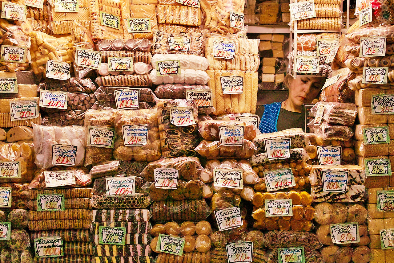 이르쿠츠크에서 보내는 세번째 날에는 중앙 시장Tsentral'nyy Rynok을 찾아갔다. 사는 모습도 구경하고 꿀도 한 통 살 생각이었다. 러시아어로 시장을 리녹Рынок이라 하는데, 러시아에는 마트처럼 생긴 실내형 재래시장이 흔한 편이었다. 빨리 걸으면 10분 만에 닿을 거리였지만 숙소에서 나와 여기도 기웃 저기도 기웃, 그러다 보니 30분도 넘게 걸렸다. 이르쿠츠크 중앙 시장은 층고가 높은 현대식 단층 건물이었다. 창문이 많아 빛도 가득 들고 밝았다. 시장 안에는 육류와 생선, 유제품, 꿀, 식용 밀랍, 견과류, 말린 과일, 타이가 허브티, 수제 피클 등 자연 식품들이 넘쳤는데 특히 채소 과일 코너의 알록달록한 색조합은 기분을 좋게 만들었다. 몇 바퀴를 돌다가 유독 사람들이 몰리는 가게를 발견했다. 과자 가게였다. 러시아 사람들은 홍차와 함께 달달한 과자나 초콜릿을 즐기는데 그래서일까 남녀를 불문하고 과자 가게 앞에 서 있는 어른들을 흔히 볼 수 있었다. 가게는 작아도 과자의 종류는 셀 수 없을 정도로 많았다. 얼굴이 보일 정도의 틈만 빼놓고는 온통 과자였다. 차곡차곡 쌓인 과자들과 그 위로 적힌 커다란 글씨들─과자의 가격과 이름─은 어떤 미술 작품처럼 느껴졌다. 거리에서도 과자로 가득한 매점을 쉽게 볼 수 있었다. 아마 이곳에 살거나 돌아갈 날이 머지 않았다면 나도 이것저것 샀을 것이다. 아직은 갈 길이 멀기 때문에 최대한 자제하며 말린 살구 500그람과 여행 내내 먹을 리뽀비 묘뜨Липовый мед(보리수꿀)만 200그람 사서 나왔다.