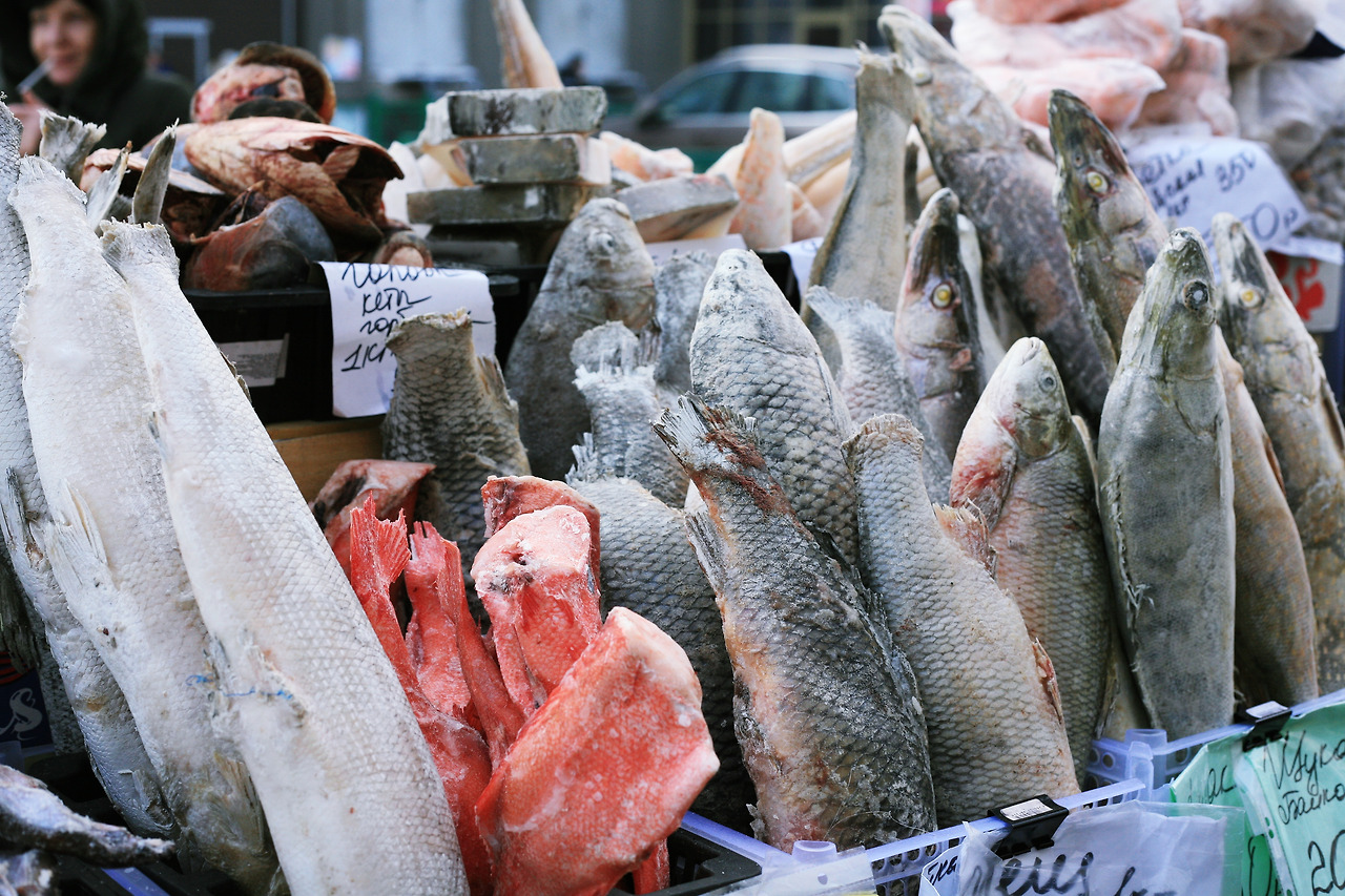 밖에도 장이 열리고 있었다. 이런 혹독한 날씨에 야외에서 장사를 하다니, 물론 먹고 산다는 건 어디서나 다 힘든 일이지만 그곳 상인들이 존경스러웠다. 그 와중에 러시아는 베리 천국이었다. 스트로베리, 라즈베리, 크랜베리, 블랙베리, 블루베리, 카우베리, 커런트 등 세상의 모든 베리들이 한데 모여 있었다. 그래서 러시아인들이 각 가정마다 바레니Варе́нье─잼처럼 보이나 물처럼 묽은 것이 특징인 설탕과 베리류로 만든 보존 식품─를 만들어서 두고 두고 먹는 모양이다. 시베리아는 잣이 특산물이었는데 여러 판매대에서 잣이 든 솔방울을 파는 걸 볼 수 있었다. 그리고 솔방울과 잣을 통째로 담아 만든 바레니도 흔했다. 한 바퀴를 돌고, 두 바퀴를 돌고, 거의 세 바퀴를 돌았던 것 같다. 서리가 내려 앉은 홍시, 알이 유난히 검은 포도, 여기저기 멍이 든 석류, 얼은 듯한 체리, 오렌지색의 씨벅톤Sea Buckthorn(산자나무) 열매, 달고나를 닮은 식용 수지, 여러 종류의 잎차, 양털로 짠 보송보송한 양말과 담요, 색색의 털실, 각종 꽃씨와 채소 씨앗들…… 없는 게 없는 시장이었다. 옷이나 신발 등 중국제 공산품들도 많이 보였다. 무엇보다 놀라웠던 건 영하 15도의 날씨에 자연 냉동된 생선들이었는데, 크기도 큰 생선들이 플라스틱 박스에 연필처럼 꽂힌 모습이 재미있었다.