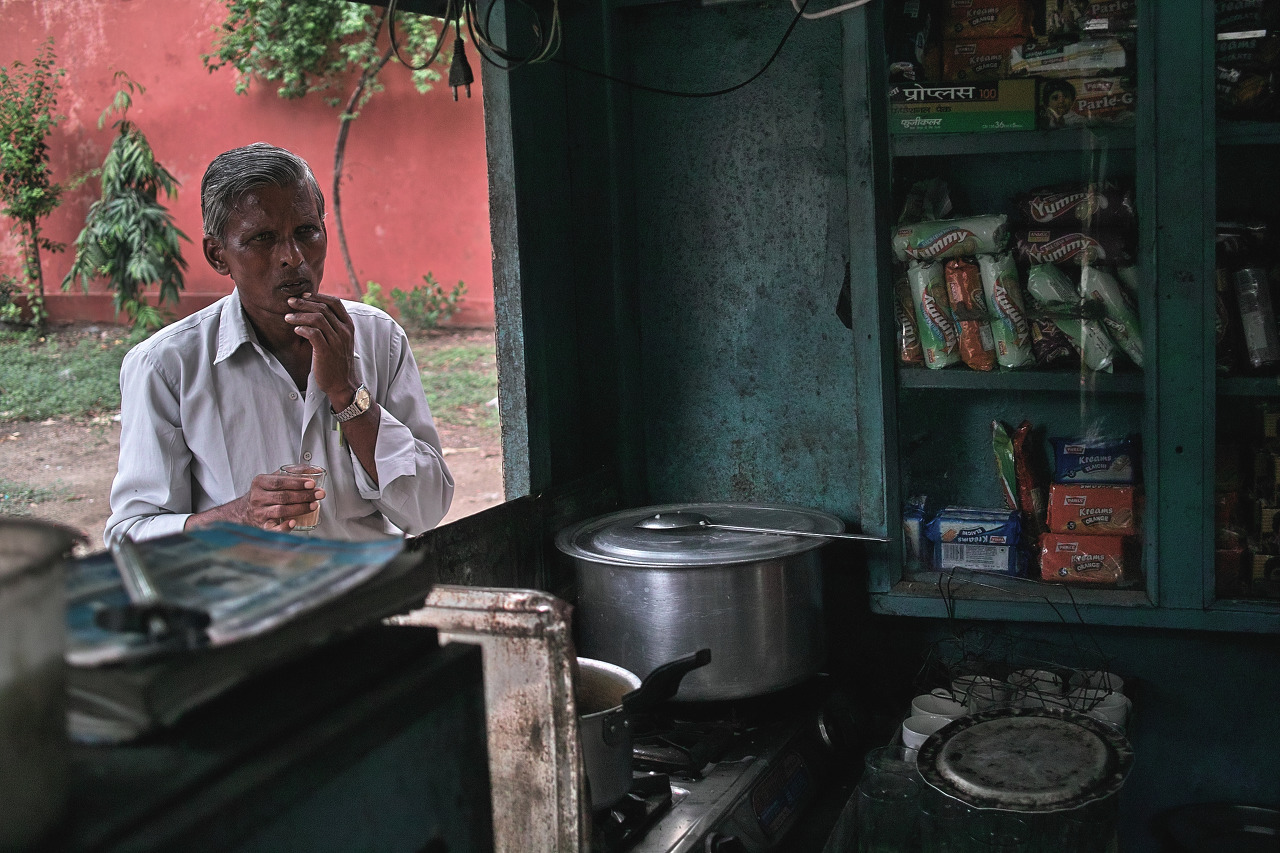 안팎의 붉고 푸른 빛, 그 조화로운 대비와 함께 그 남자가 창 가까이 다가옴으로써 내가 원하는 사진적 장면이 만들어졌다. 그의 알 수 없는 표정과 손에 들린 뜨거운 짜이(chai)*, 새 것처럼 빛나는 손목 시계, 그리고 매점 안에 진열된 과자들과 크고 작은 냄비들, 또 여러 개의 컵들까지, 내 눈에는 그것들 하나하나가 각각의 이야기를 가진 듯 보였다.