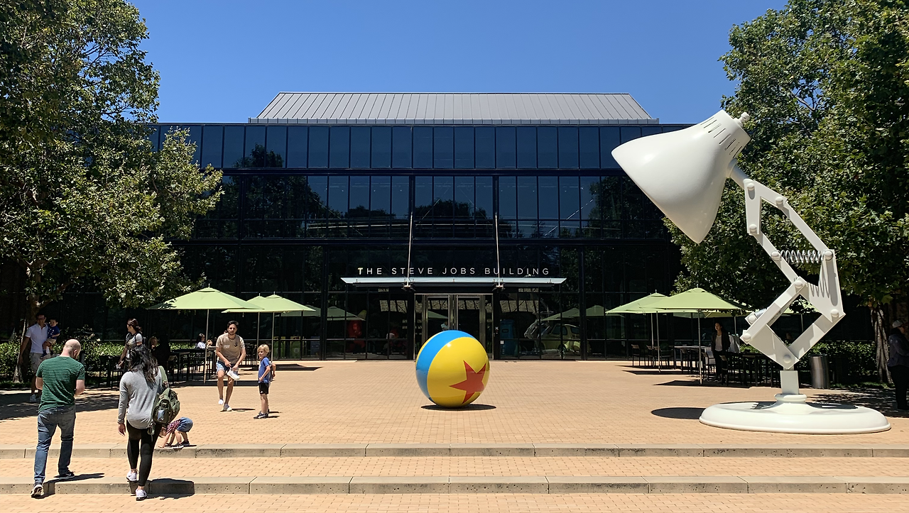 44. 메인빌딩인 스티브잡스 빌딩은 입구에서 들어와 바라보는 것을 기준으로 크게 1층 로비와 왼쪽, 오른쪽 사무실로 나뉘는데 논리를 담당하는 좌뇌와 창조를 담당하는 우뇌의 구조를 본 따 왼쪽에는 컴퓨터그래픽 작업 부서가 있고 오른쪽에는 스토리와 애니메이션 부서가 있다. 그리고 통유리창으로 된 거대한 로비에 룩소카페, 우편함, 휴게공간, 기념품샵 등이 모여 있어 모든 직원들이 이 곳에서 만나 소통할 수 있는 구조다. 설계 당시 스티브잡스가 낸 아이디어라고 하는데 정말 잡스가 잡스했다.