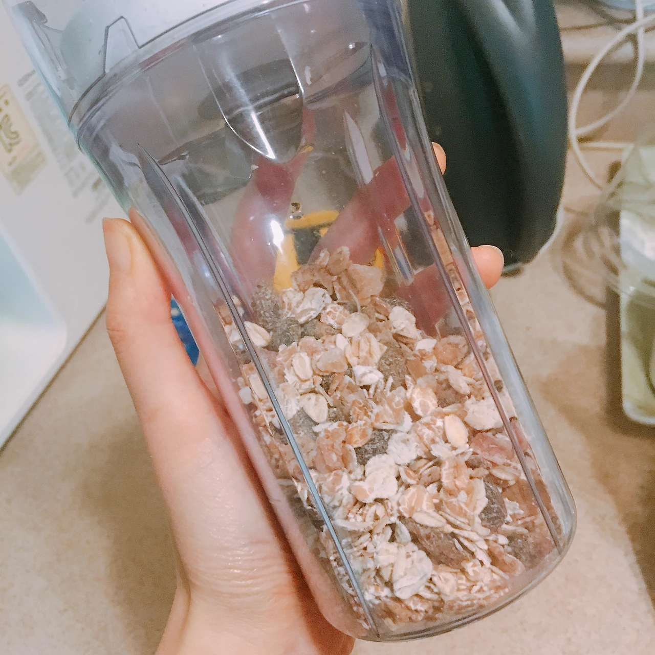 뮤즐리의 입자가 거칠기 때문에, 반죽이 잘 뭉치게 하는 용도로 절반 정도는 갈아준다. 여기에 나머지 뮤즐리를 원물 그대로 담아 끈적한 느낌이 들 때까지 섞는다.(고운 가루는 반죽이 잘 뭉치도록 도와주고, 거친 입자들은 씹는 느낌을 준다. 부풀어 오르는 과정이 딱히 필요 없는 쿠키므로, 끈적해 보이는 점도가 될 정도로만 섞는다.)