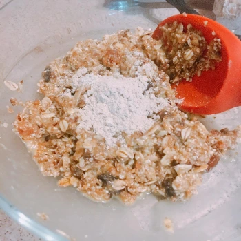 여기에 재료(밀가루, 오트밀, 설탕, 시나몬 등 기호에 따라)를 부은 뒤 섞는다.