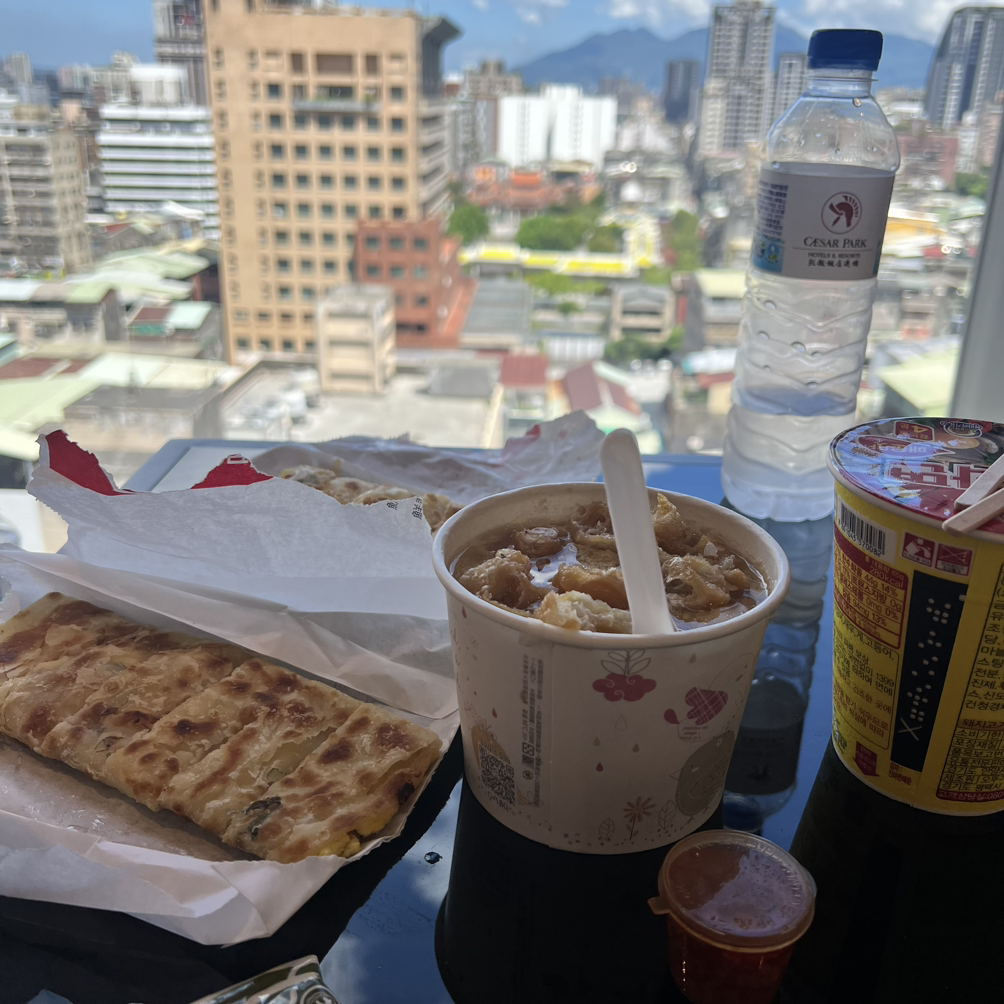 비행기 시간이 넉넉하지는 않아서 우리는 어제 계속 구경하던 우버로 배달을 시켜보기로 했다. 아침 메뉴로 유명한 또우장과 딴삥을 찾아 시켰다. 그렇게 시켜놓고 마지막으로 짐을 싸고 준비를 마쳤다. 이지카드를 박박 긁어 쓰기 위해 편의점을 가서 쇼핑을 하고, 커피를 샀다. 그렇게 다시 들어와 배달 음식과 함께 타이베이에서의 마지막 끼니를 먹었다. 저 멀리 용산사가 내려다 보이는 평범한 뷰에, 화창하고 맑은 날씨를 끼얹으니 한 편의 그림과 함께 식사를 하는 기분이 들었다. 그런 데다가 배달 음식은 전부 성공적인 맛이었다. 또우장이 우리가 보던 그 느낌은 아니었지만 그래도 맛있으니 됐다. 딴삥은 참치 딴삥과 베이컨 치즈 딴삥을 먹었는데 걱정하던 참치 딴삥이 훨씬 맛있어서 신기했다. 다음에 또 타이베이에 온다면 직접 가서 먹고 싶었다.