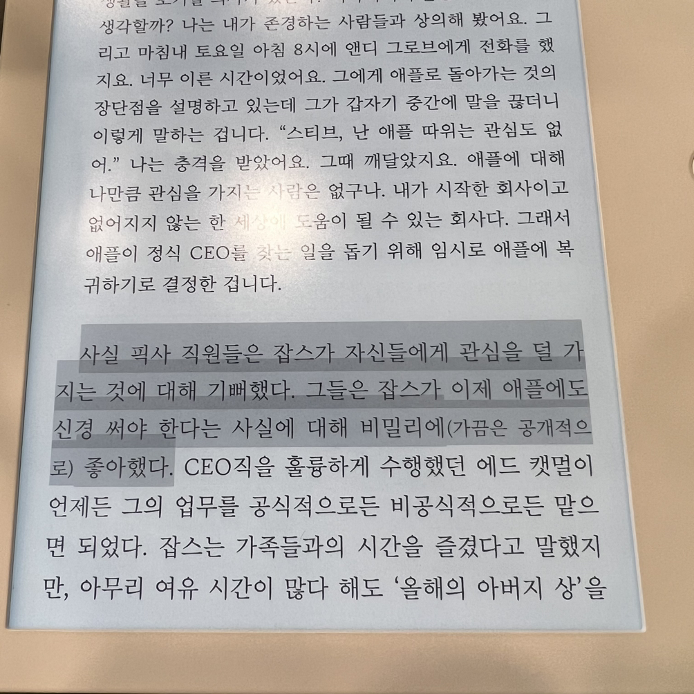 애플은 사피엔스 역사상 한 획을 그은 기업이다. 애플과 아이폰이 없었다면 우리가 지금 누리고 있는 스마트한 세상은 아직 안 왔거나, 더 늦게 왔을 것이다. 그런 점에서 스티브 잡스를 멋진 사람일 것이라 생각했다. 그런데 실제로 그에게는 고집불통의 현실왜곡장으로 가득한, 내가 생각한 멋진 리더와는 거리가 먼 사람이었다. 다른 사람의 말을 들을 줄 모르고, 자기가 선택한 답으로만 기억하는 그런 사람. 내가 제일 싫어하는 상에 가까운 모습이다. 그래서 책을 읽는 내내 실망했다. 왜 자기 자식을 부인하고 모욕하는지 이해가 되지 않았다. 훗날 가장 후회하는 일 중 하나라고 했지만 잡스의 그런 모습은 결코 좋은 사람처럼 볼 수 없었다.