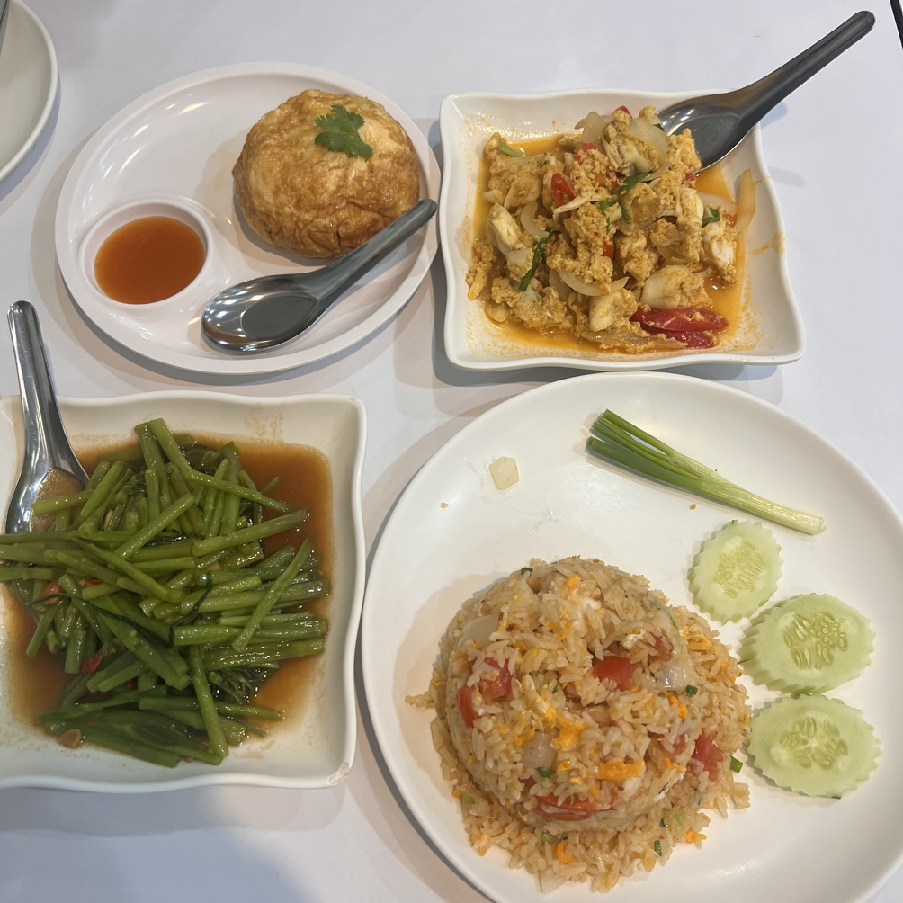 기내식을 그렇게 먹고 안고플 줄 알았던 배는 나를 배신했다. 배고파서 빨리 밥이 먹고 싶어서 선크림을 벅벅 바르고 사원을 가기 위해 옷을 갈아입었다. 짧은 치마는 입장하지 못할까 봐 나름 긴치마를 입고 영상을 찍어보겠다는 마음으로 산 카메라를 챙겨서 나왔다. 트래픽잼이 심한 방콕 거리에서 첫 일정은 걸어서 가보기로 했다. 호텔이 카오산로드와 가까웠기 때문에 카오산로드 쪽에 있는 [크루아압손]에서 밥을 먹기로 했다. 신난 우리는 푸팟퐁커리, 새우볶음밥, 모닝글로리 볶음, 오믈렛 무려 4개의 메뉴를 시켰다. 왜 그랬는지는 아직도 의문이지만 4개나 먹고 싶었나 보다. 양이 많은 편은 아니었지만 둘이 먹기에는 다소 많은 메뉴긴 했다. 그래도 맛있게 먹으면서 다음에는 메뉴 개수를 줄이자고 다짐했다. 맛있게 먹고 일정대로 왓포를 보러 가기로 했다.