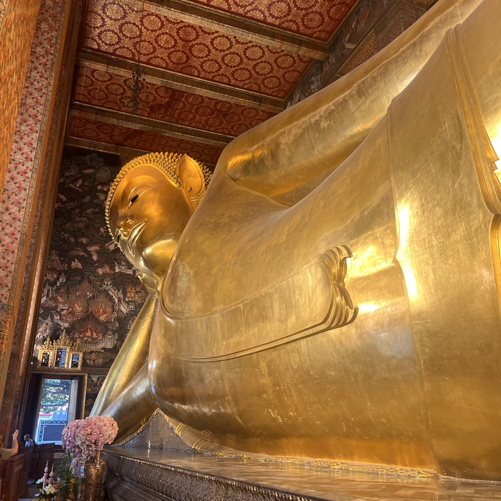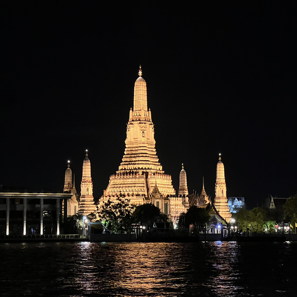 왓포는 아주 거대한 불상이 누워있는 일명 와불이 가장 유명했다. 사기를 당할 뻔해서 후문으로 들어온 우리는 다들 찾기 어려워하는 와불이 있는 출입구로 들어와서 수월하게 만날 수 있었다. 뜻밖에 사기꾼에게 도움도 받은 게 있구나. 사기를 당하지 않았다는 안도감에 사기꾼을 욕하면서 왓포에 온 것을 마음껏 기뻐했다. 니들이 아무리 사기를 쳐도 나는 당하지 않는다며 잔뜩 으스대며 다녔다. 기분이 좋았다. 태국 느낌이 물씬 나는 왓포의 매력에 시간 가는 줄 모르고 구경하다가 나와서 왓포 선착장 쪽으로 향했다. 왓아룬은 그냥 멀리서 구경하기로 했다. 가장 아름다운 풍경으로 유명한 해질녘에 도착해서 눈에 보이는 풍경이 너무 예뻤다. 카메라로는 그 아름다움을 다 담지 못했지만 눈으로 볼 때는 진심으로 황홀했다. 한국에서 촘아룬이라는 곳을 이미 예약하고 왔는데 그 예약 시간까지는 1시간가량 남았다. 다른 카페를 가있을까 했지만 카페가 다 일찍 문을 닫았다. 고민 끝에 DM을 보냈더니 한 자리 남았으니 와도 된다고 해서 냅다 들어갔다. 가서 보니 우리 자리에서도 왓아룬이 매우 잘 보였다. 계속 사진과 동영상을 찍었다. 땡모반과 팟타이를 시켰는데 이상하게 배가 하나도 고프지 않아서 음식을 한 입만 먹고 땡모반만 들이켰다. 한국에서는 수박도 안 먹고 수박주스는 쳐다도 안 봤는데 이상하게 땡모반의 매력에 홀려버렸다. 왜 이렇게 맛있는지 이 맛을 잊지 못해 지금도 땡모반 노래를 부르고 있다. 아름다운 야경과 함께 마셔서 더 맛있었을 수도 있다.