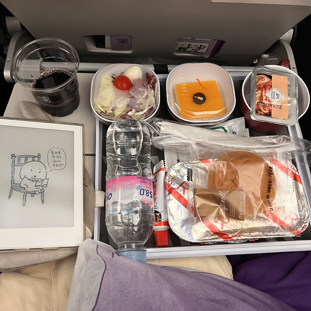 공항에 도착해서 들어가자마자 타이항공 수속하는 곳이 있길래 확인도 안 하고 냅다 들어갔다. 그러고 나서 타이항공이 여기만 가는 것은 아닐 텐데 맞게 들어왔는지 앞사람에게 확인했더니 다행히 방콕을 가는 비행기 줄이 맞다고 했다. 미리 체크인을 해놨기 때문에 무난하게 짐을 보내고, 환전한 돈을 찾아서 안으로 들어갔다. 6시간의 비행은 나에게 많은 준비를 하게 만들었다. 기내에서 볼 이북리더기와 목베개, 발해먹 등을 가득 담은 기내용 가방이 매우 무거웠다. 그 와중에 면세로 산 건 왜 이리 많은지 들기가 빡셌다. 나름대로 3시간 전에 도착했지만 줄 서서 낭비하는 시간이 꽤나 많았기 때문에 밥 먹고 나니까 면세를 구경할 시간도, 커피를 사 먹을 시간도 없이 화장실만 갔다가 비행기를 탑승해야 했다.
