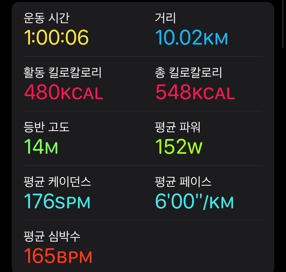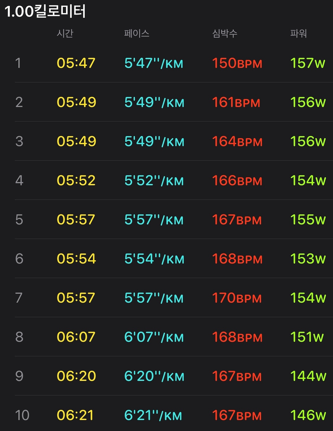 첫 1km를 달리는 데 몸이 매우 가벼운 것이 심상치가 않았다. 좀 전까지 아플 거 같고 힘들 거 같고 다칠 거 같다는 생각에 나오기 싫었는데 왜 몸이 가벼웠는지는 아직도 의문이다. 그렇게 애플워치가 알려준 기록을 보니 무려 5분 45초대로 뛰었다. 이어서 그다음 1km도 그다음도 5km를 다 뛰고도 지치지 않고 계속 5분대를 유지했다. 신기한 일이었다. 그래서 아까 마음먹었던 1km만 더를 적용해서 뛰었다. 6km를 찍고 나니 ‘오늘 10km를 다 뛰면 대회날까지 다시는 10km를 연습하지 않는 보상을 줄게 뛰어 보자 나 자신!’ 속으로 이런 거래를 하고 있었다. 그래, 오늘 벌써 6km를 뛰었으니 나머지를 채우는 게 더 쉽지. 다른 날 다시 10km를 뛰려면 얼마나 힘들겠어. 이런 마음으로 계속 뛰었다. 놀랍게도 7km까지 5분대로 뛰는 기적이 일어났다. 그런데 7km를 지나자마자 체력이 급격하게 떨어졌다. 그만 뛰고 싶다는 생각이 뇌를 지배했다. 아무도 뭐라고 하지 않을 텐데.. 7km도 대단한데.. 그만해도 될 거 같다는 생각이 1초에 한 번씩 들었다. 근데 대회 날까지 다시 10km를 안 뛰어도 된다는 저 거래 조건이 너무 완벽했기에 뛸 수 있다고 세뇌를 하기 시작했다. 이 구간을 3번만 더 지나면 끝이니 힘을 내보기로 했다. 그래도 계속 포기하고 싶다는 생각이 강렬하게 뇌를 지배했지만 그럴 때마다 이미 뛰어 놓은 8km가 아깝지 하면서 열심히 뛰었다. 그리고 마침에 9km를 뛰었을 때는 몸이 점점 처졌지만 도저히 멈출 수가 없었다. 고지가 눈앞이지 않나.