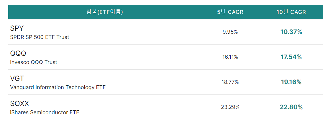 8% 연평균 수익률이 비현실적이라고 생각할 수도 있다. 하지만 미국 주식 시장의 주요 ETF 연평균 성장률이 최소 9%에서 최대 24% 정도에 달한다는 것을 생각해 보면 글에서 제시한 수익률이 그다지 무리한 것이 아니란 것을 알 수 있다. 심지어 동일한 기간 개별 종목을 잘 공부하고 투자했다면 연평균 수익률을 최대 27%까지 끌어올릴 수도 있다.