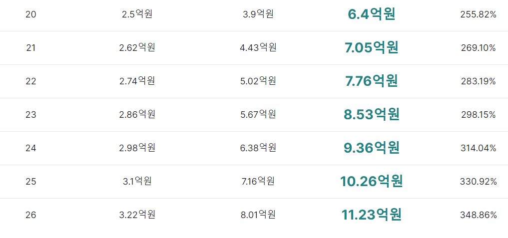 20년 차에 투자 원금은 2억 5천만 원이 되고 원금 대비 우리는 3억 9천만 원의 수익을 얻어 6억 4천만 원의 자산을 가지게 된다. 더욱 놀라운 것은 25년 차에 10억 2천만 원이었던 평가 금액이 26년 차에 11억 2천만이 된다는 것인데, 이는 드디어 위에서 언급했던 1년 만에 자산이 1억씩 증가하는 순간이 찾아온 것이라고 볼 수 있다.