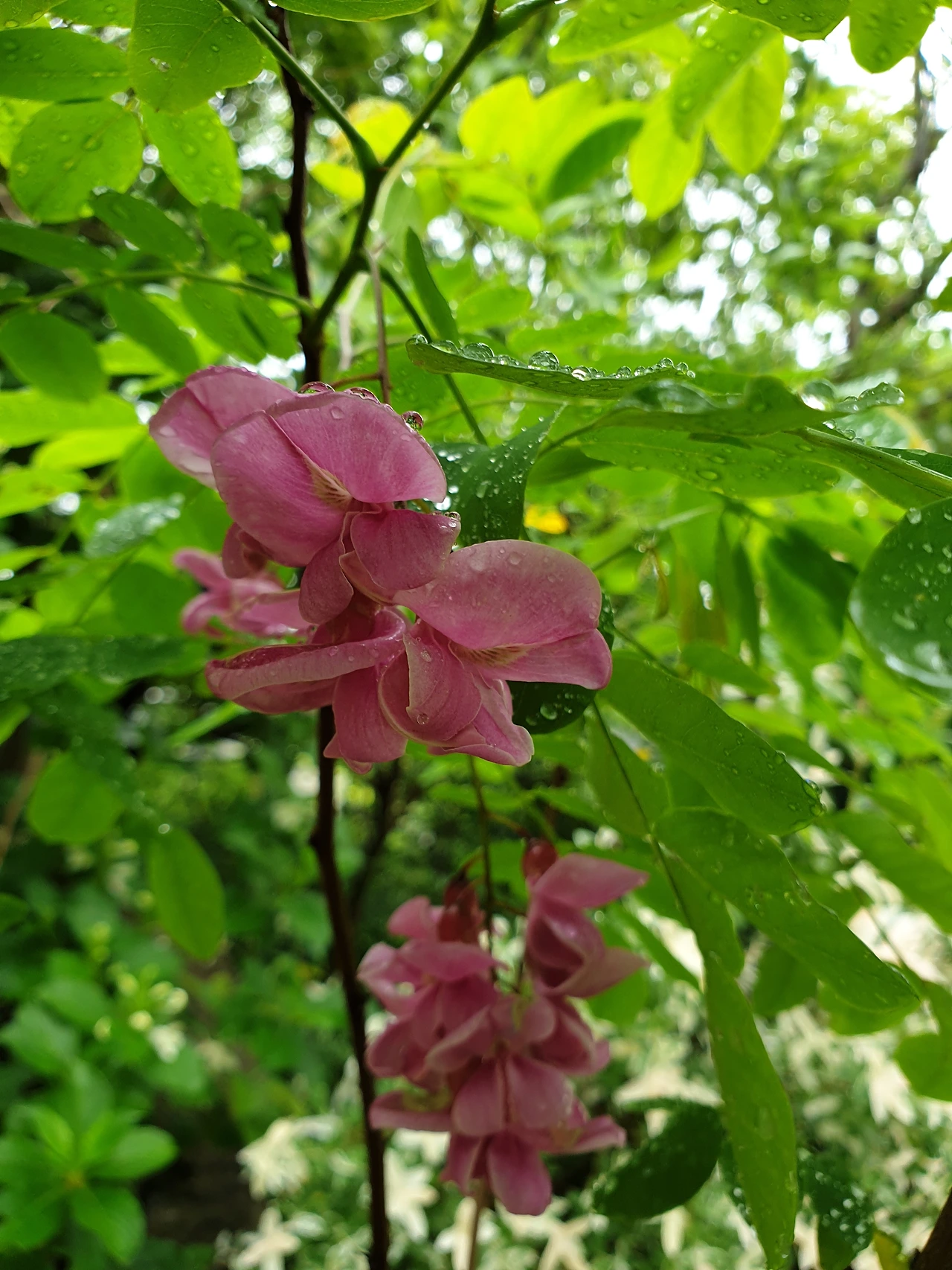 봄에 핀 붉은 아까시 - 미국 아까시나무를 스페인에서 관상용으로 품종개량한 것이라 한다. 흰꽃보다 조금 더 크고 한 송이에 달린 꽃 수는 적으며 향기도 옅다.