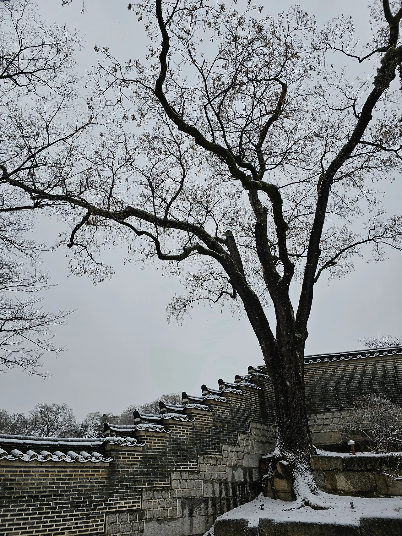 이 나무의 이름을 모르겠다. '식물 하는 사람이 척 보면 알아야 하지 않나?' 하고 물으신다면, 제주에 사는 남부 수종들이야 모를 리 없지만, 우물 안에서는 아무리 오래되어도 고인 물일 수밖에 없다고 답하겠다. 잎새라도 있으면 식물 찾기 앱을 뒤져서 이내 찾아낼 텐데 아직 눈 내리는 겨울이니 수피만으로 알 수가 없다. 수피가 골진 모양이 녹나무를 닮긴 했으나 낙엽수와 상록활엽수의 간극은 너무도 크다. 복원되었거나 새로 쌓은(성벽은 아닌) 담장이다. 담에 바짝 붙어 자랐으니 수령 짐작이 어려울 만큼 거목이라 해도 조선시대 나무는 아닐 것이다. 궁 안에는 보안상의 문제로 왕조시대에는 나무들이 많지 않았을 것이다. 더군다나 담에 붙여 심은 나무라면 조경설계자의 특이한 취향이었을 것이다. 씨가 날려 자랐을까. 아무튼 협소한 축대 위, 담장 곁에 바짝 붙어 자라는 이름모를 나무는 뿌리가 노출되어 축대를 감싸 안고 있다. 캄보디아 앙코르와트의 뿌리가 흘러내리는 거목과 비교할 만큼은 아니지만 나무의 긍정과 생존의 의지는 감탄할만하다. 수고는 10m를 넘어 보인다. 나무의 수형과 크기는 뿌리와 비슷하다. 극히 일부만 보이는 뿌리는 땅속으로 얼마나 광대하게 뻗고 있을지 짐작케 한다.