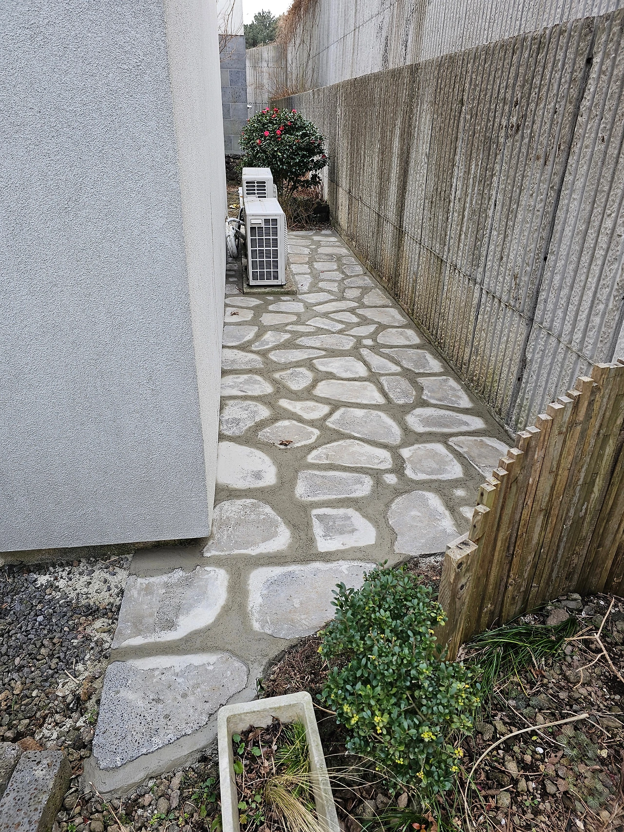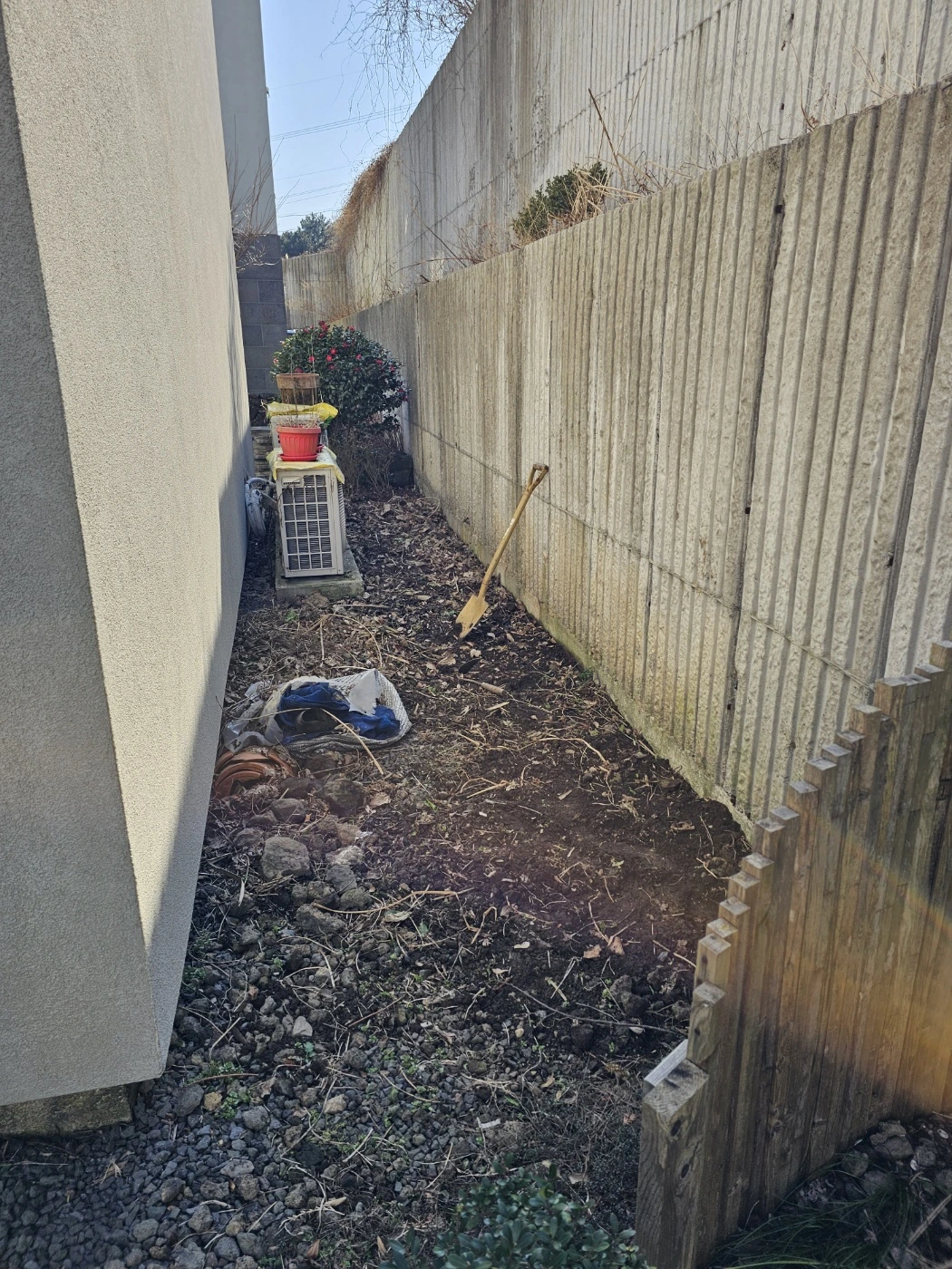 주택과 옹벽사이 기다란 통로에 제주난석을 깔았다. 건물과 옹벽으로 사방이 막힌 땅이다. 햇빛이 정오를 지나며 스친다. 낮에 어둡지는 않아도 식물이 잘 자라기에는 모자라는 일조량이다. 음지 식물은 자랄 수 있다. 풀도. 갖가지 이름 모를 풀까지 이 작은 땅에 수시로 자리잡고 버틴다. 봄부터 가을까지 세 계절은 풀들의 시간이다. 세컨하우스로 서울에서 가끔 내려오는 주인은 꽃보다 풀 보는 시간이 더 많다가 올라 간다. 그러기를 몇 해 정원주는 말했다. "그거 깔아주세요. 판석이요." (풀을 이곳에서 보고 싶지 않아요.)