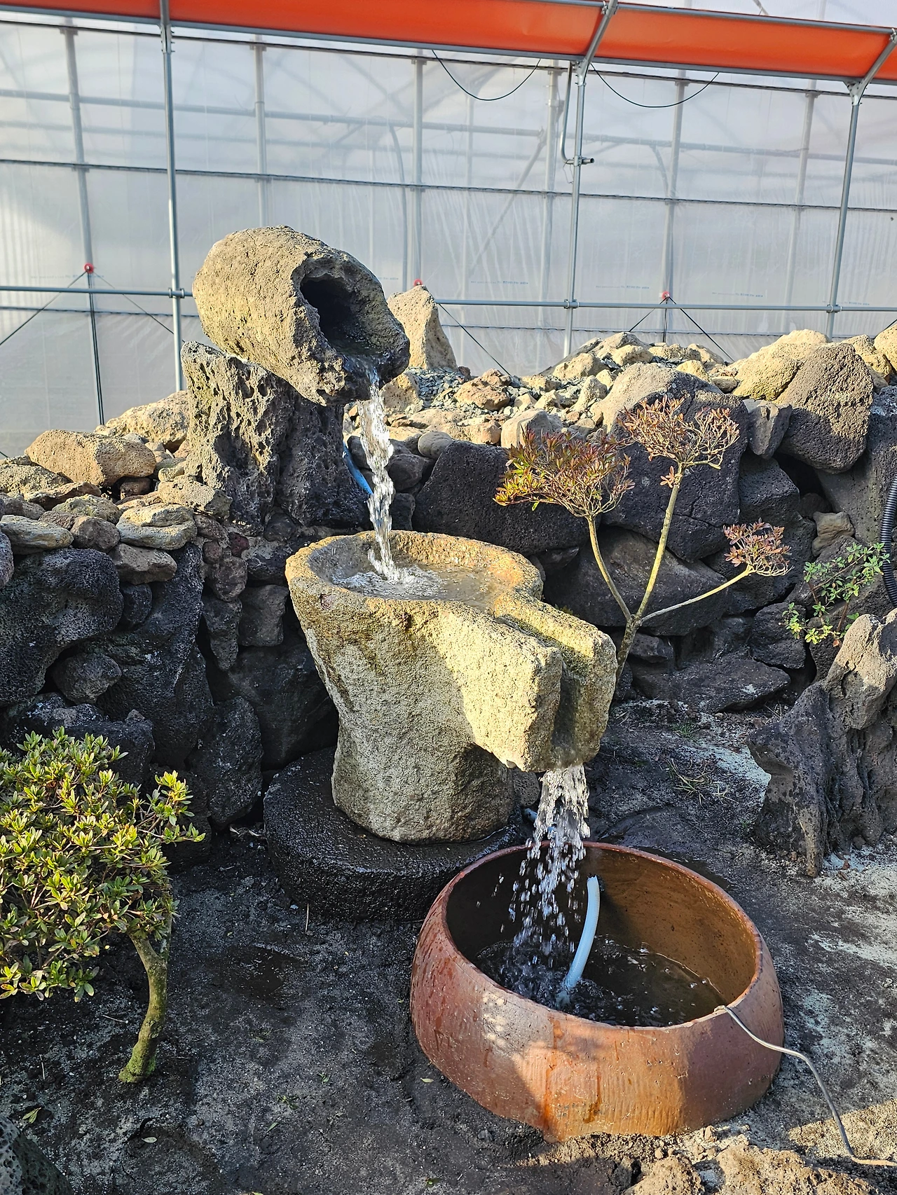 천혜향 농원주가 의뢰한 물확폭포를 만들었다. 재료는 농원주가 틈틈이 모아놓은 구멍돌(라바트리:용암이 나무를 태우고 굳어진 돌)과 역암물확(육지산), 옹기항아리를 사용했다. 수량이 많은 모터를 원한다고 했다. 60W 모터를 구입하여 3일 만에 받아 설치했다. 수량이 물확에 비해 너무 많았다. 다시 중간 용량인 30W 수중모터를 인터넷으로 주문했다. 전기 단자함 안에 누전차단기 설치했다. 모터에서 구멍돌로 호스를 연결했다. 가장 어려운 작업은 항아리를 자르고 구멍을 뚫는 것이었다. 자르려는 부위에 안팎으로 테이프를 붙이고 매직으로 선을 그은 다음, 핸드 그라인더에 석재 절단용 원형날을 장착하여 조금씩 선을 긋듯이 컷팅했다. 깨지지 않게 작업하는 것이 관건이다. 핸드그라인더는 작업 중 놓치면 매우 위험하기에 조심해야 한다. 구멍 뚫기는 더 힘들었다. 드릴로 안 돼서 그라인더로 회전하며 구멍을 냈다. 호스와 전선을 통과시키고 실리콘으로 틈을 메워 물이 새지 않게 했다.