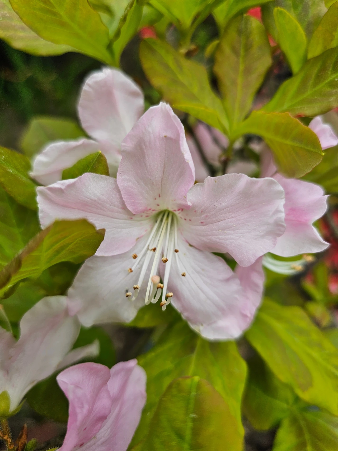 철쭉보다는 연하고 진달래 보다 화려한, 그 둘 사이에 있는 꽃이다. 이름이 연달래이니 철쭉보다 진달래에 가깝다고 하겠다. 꽃은 큰 편이고 잎새는 상수리 잎처럼 생겼다. 흰 바탕에 핑크빛이 살짝 물든 자태가 신부의 홍조 띤 얼굴 같다. 레이스 달린 웨딩드레스 같기도 하다. 화분에 심고 일 년은 몸살을 하는지 잎새도 빈약했다. 지난해 가을에 유기질 비료를 얹어 놓았다. 양분을 충분히 공급받아서 잎새도 꽃도 좋아 보인다. 음식이 다를 뿐 사람이나 식물이나 잘 먹어야 건강한 건 똑같다. 건강한 식물이 꽃도 잘 피고, 오래가고, 벌레도 안 탄다.