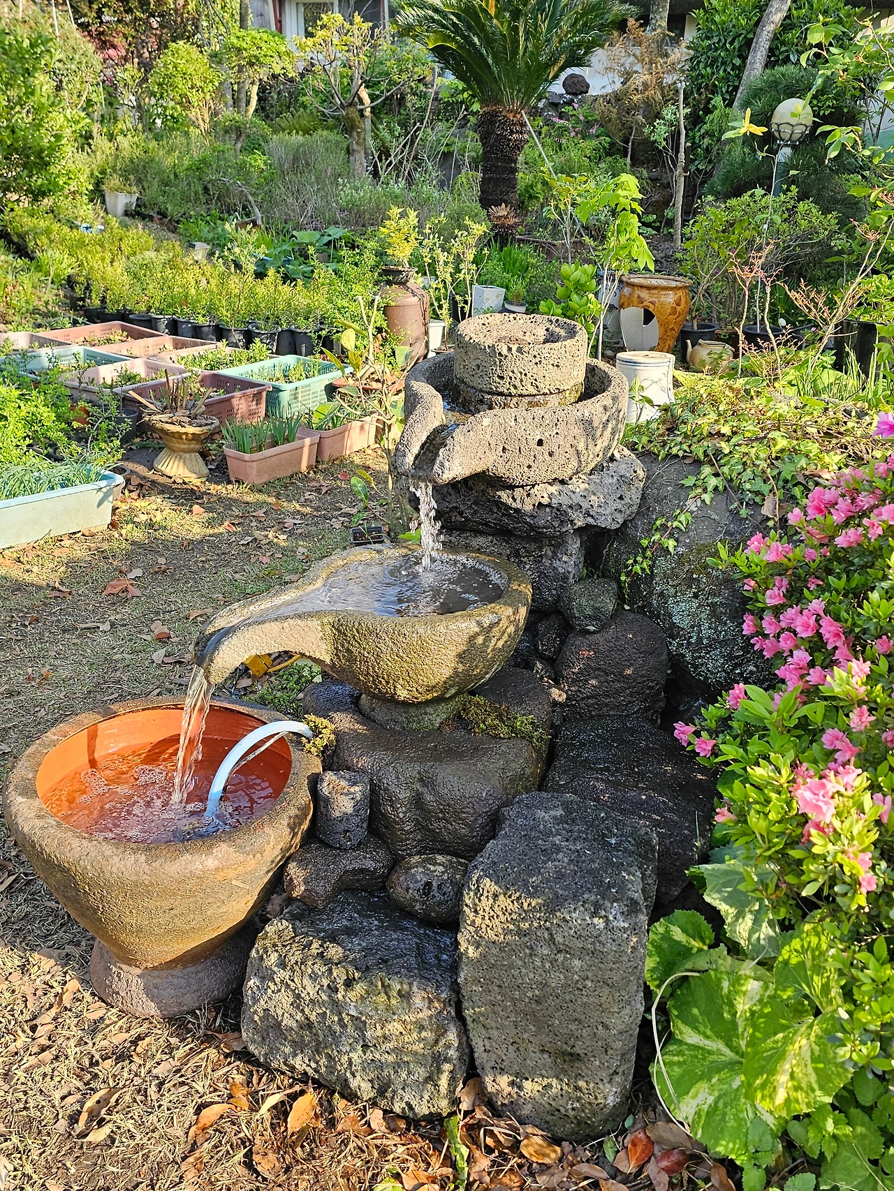 다음날 뭔가 허전한 느낌이 들어 3단 폭포로 만들어 보았다. 현무암 각 돌을 쌓고 안 맞는 부분은 함마드릴로 깎는다. 흔들어 보면서 쐐기 돌을 고여주고 움직이지 않게 고정한다. 풀고래에 물호스를 연결하기 위해 함마드릴로 구멍을 뚫는다. 호스를 끼워 올리고 호스와 돌의 틈새를 강력 본드와 돌가루로 메워 물이 새지 않게 한다. 물을 흘려 물줄기가 제대로 흐르는지 확인한다. 수반이나 풀고래를 바꿀수도 있다.