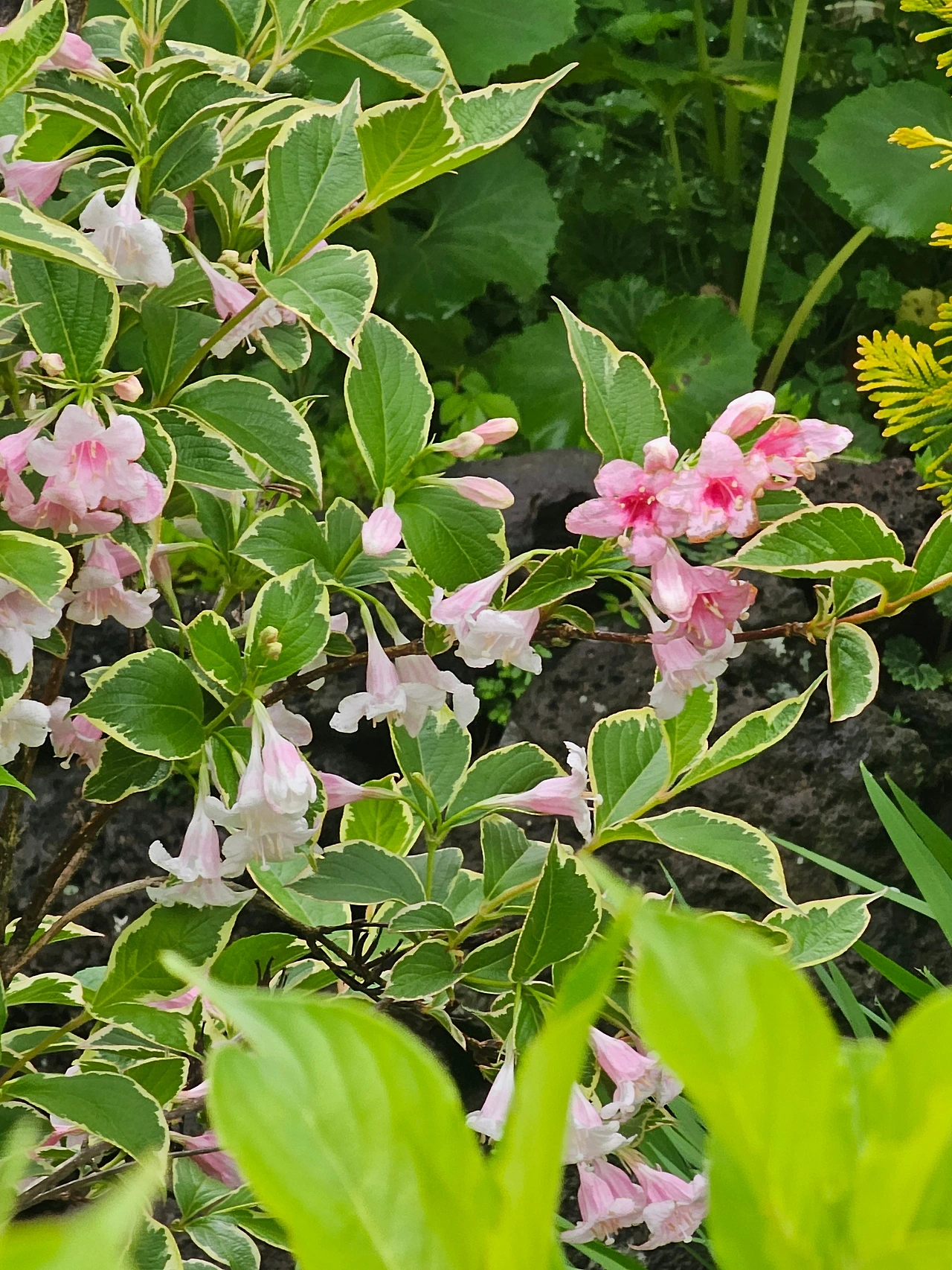 한라산 관음사 코스 삼각봉을 지나 어디쯤에서 병꽃나무가 자생하는 것을 보았다. 이는 추위에 강하다는 것이다. 정원에 키우는 종류는 네 가지다. 분홍, 빨강, 무늬잎, 삼색이다. 분홍병꽃이 4월에 가장 먼저 피고, 무늬잎과 붉은색은 5월 초에 핀다.