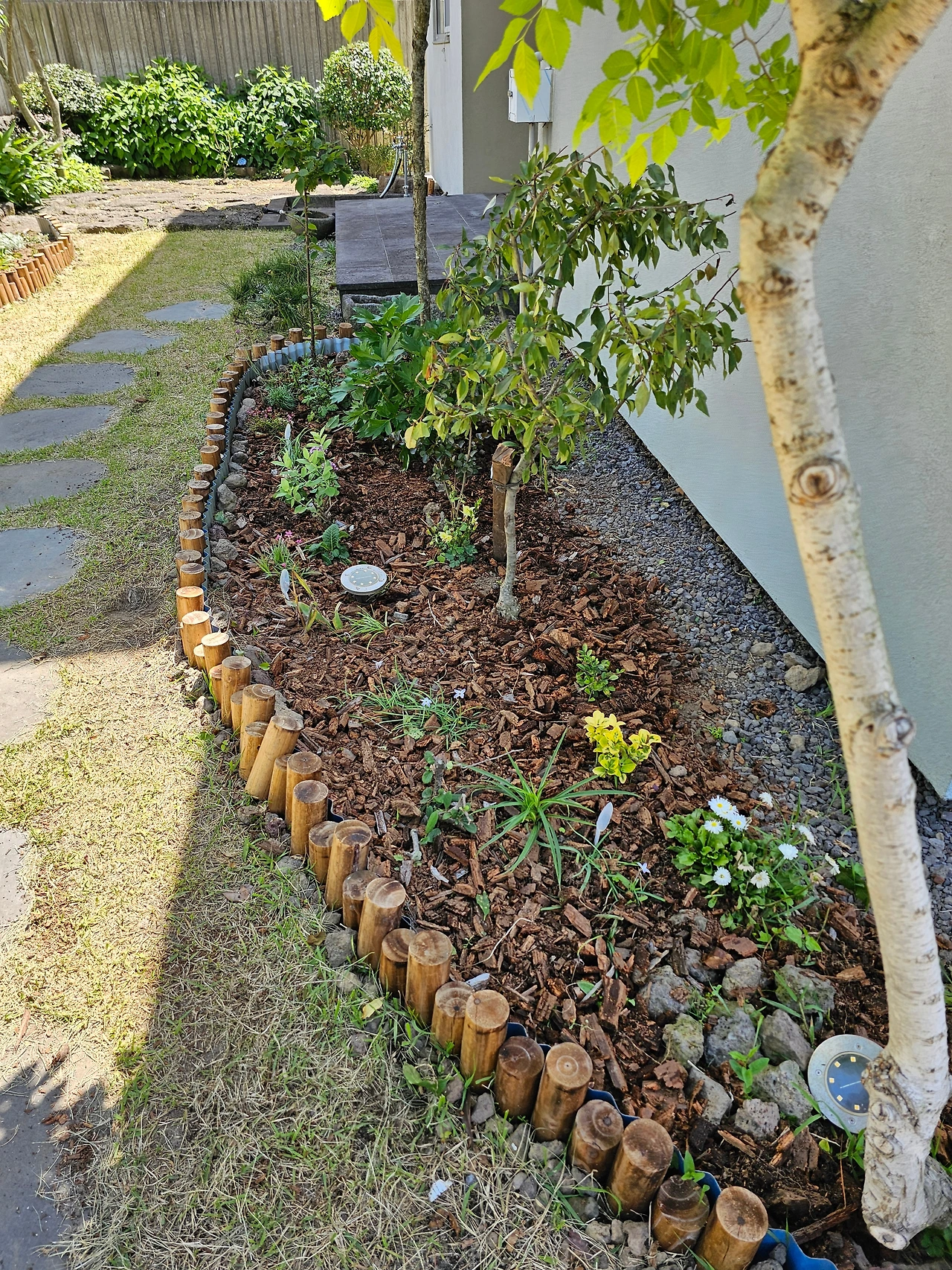 화단에 개복숭아 나무, 앵두나무, 황금느티나무와 초화류가 자란다. 그리 크지 않은 땅이어도 풀은 수시로 나고, 자라고, 씨를 맺는다. 여기에 바크를 덮었다. 바크는 파쇄한 나무 조각들이다. 톱밥보다 훨씬 크다. 지면에 햇빛을 차단하여 풀이 자라지 않게 한다. 여름에 뜨거운 햇살을 막아 주고 보습 효과도 있다. 겨울에는 보온이 된다. 바크가 삭으면서 거름도 된다. 웬만한 바람에도 날리지 않는다. 구입은 인터넷 검색하면 다양하게 나온다. 화단을 가꾼다면 장점 많은 바크를 깔아 주길 권한다.