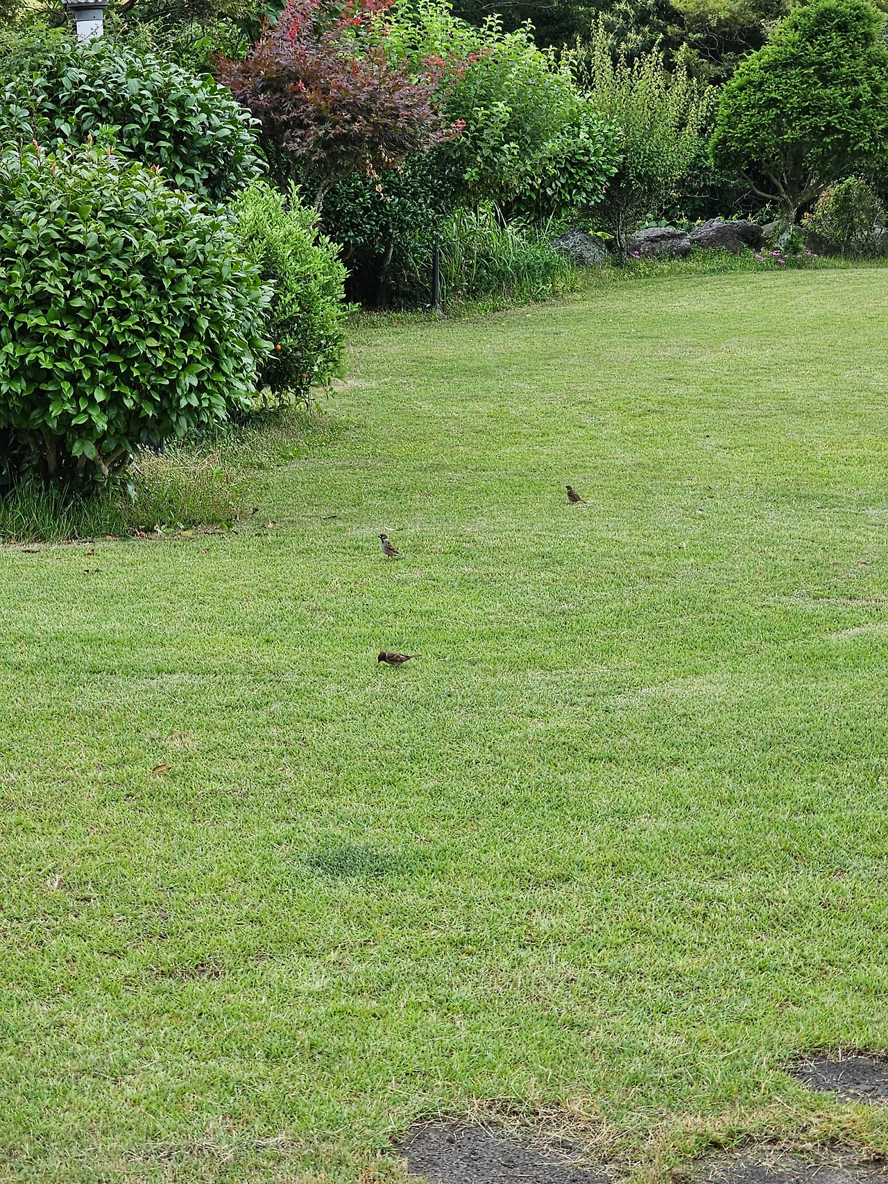 깔끔하게 깎인 잔디에 참새들이 풀씨를 먹으러 왔습니다. 참새는 눈이 참 좋은가 봅니다.