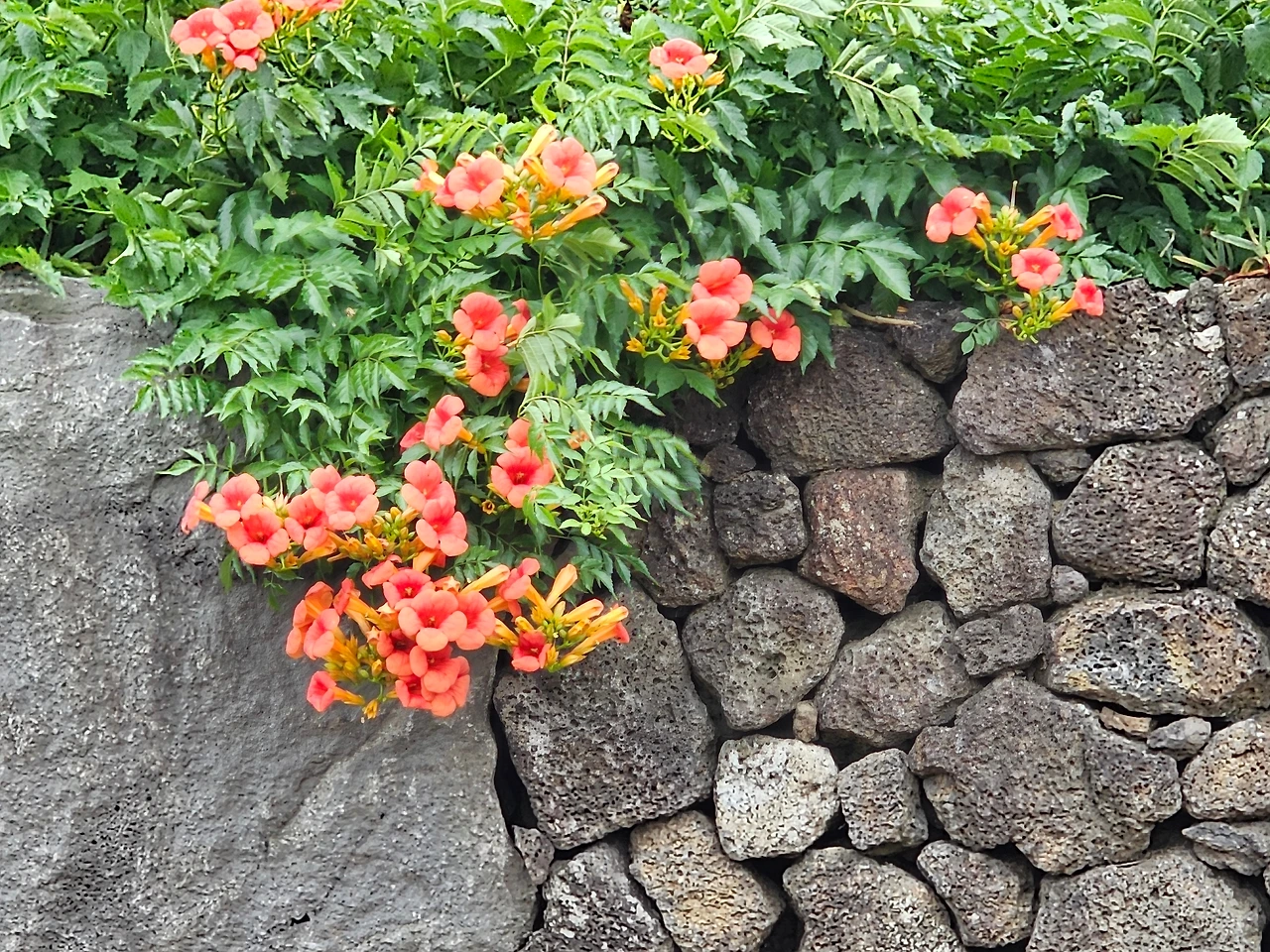 주황색은 여름의 색일지도 모른다. 참나리도, 범부채와 애기범부채도 주황색이다. 꽃은 태양을 닮기도, 나팔 같기도 하다. 홀로서기 보다 무언가를 딛고 오르는 넝쿨식물이다. 담장 밖이 궁금했는지 돌담 위를 넘었다. 행인들의 시선을 담뿍 받는다.