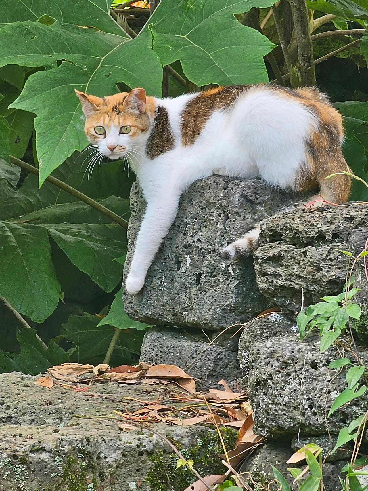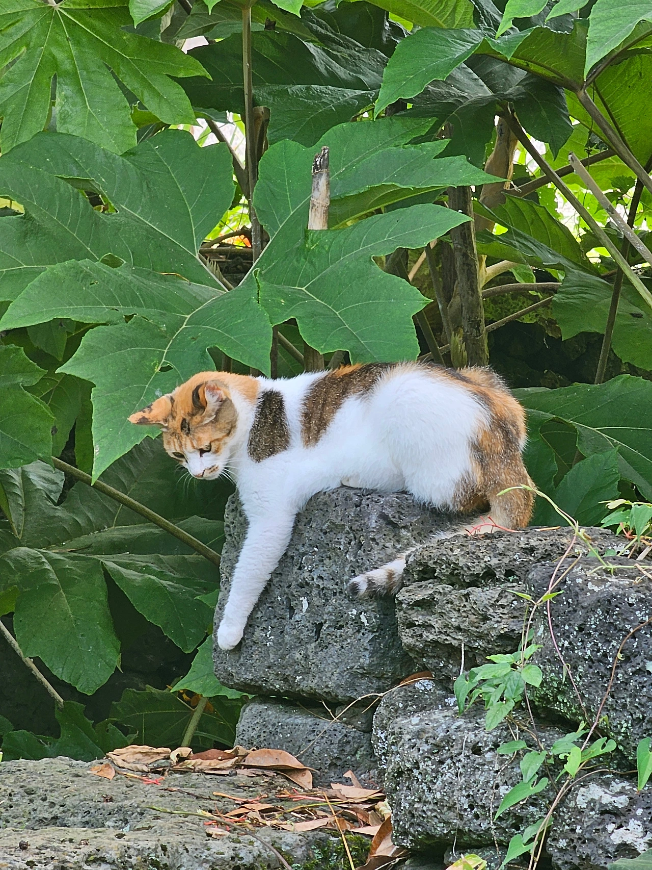 잊을만하면 한 번씩 모습을 드러내는 삼색이. 처음 흘러들어 온 지 오 년은 넘은 것 같다. 연못비탈에서 미약한 냥이 울음소리가 들렸다. 조심히 살펴보니 주먹만 한 새끼 고양이가 위태롭게 돌틈에 매달려 있었다. 맨손으로 잡아 올리는 순간 손가락을 물어버렸다. 야성 본능이 구해 주려는 손을 위협으로 인식했던 것이다. 입양하기는 어렵다고 생각하고 데크 위에 밥을 챙겨 주었다. 그 녀석은 경계심을 갖고서 사료를 꾸준히 먹었다. 세 가지 색을 따라 삼색이라 이름 지었다. 물린 손은 꽤 아팠고 상처는 오래갔다.