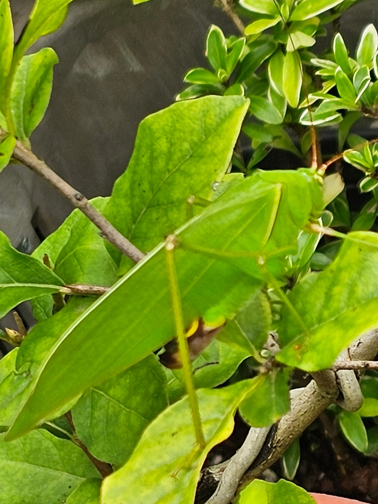 화려한 날갯짓을 따라 눈길이 머문 곳에 여치로 보이는 곤충이 앉았다. 검색해 보니 배짱이다.