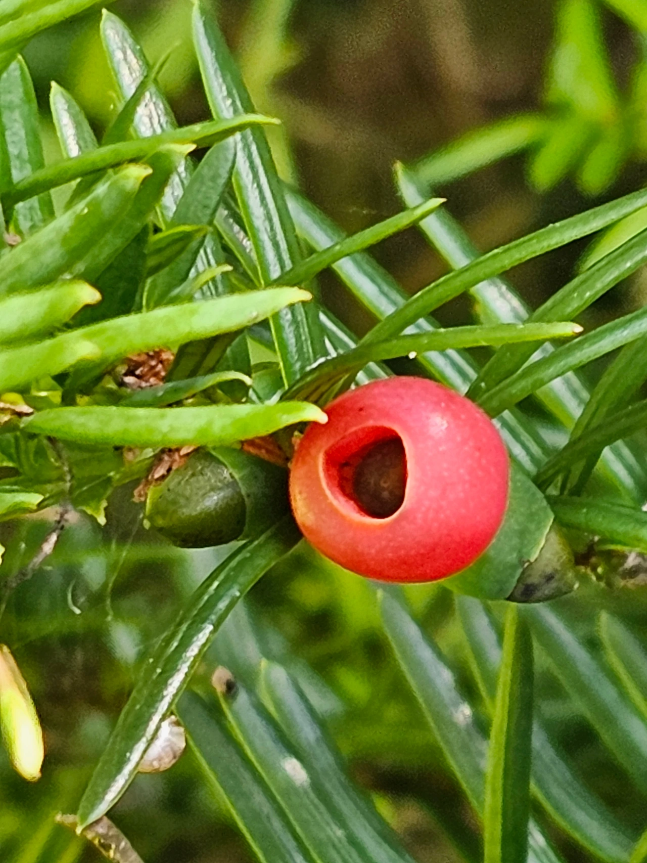 주목 열매가 어느새 익었습니다. 가을이 깊었을 때 본 기억이 있어 팔월에 빨갛게 되리라고는 생각지 못했지요. 8, 9월에 익는 열매라고 합니다. 저는 주목을 가까이 두고 키우지 않습니다. 대부분의 조경인들이 기피하는 나무이기도 합니다. 왜냐하면 주목의 이식은 까다로운 편이기 때문입니다. 뿌리가 좋음에도 이식 후 잘 죽습니다. 수목의 하자는 비용손실이지요. 주목의 이식은 적절한 전정과 물관리가 중요합니다. 시기도 가을~이른 봄까지 가 좋고요. 굼벵이가 가장 좋아하는 나무라서 식재 구덩이를 파고 굼벵이약을 반드시 뿌려 주어야 합니다. 늘 푸른 나무로 상록 침엽수입니다. 이식 후 잎새가 노랗게 마르기 시작하면 살리기는 거의 어렵습니다. 어린 묘목은 이식이 대체로 잘 됩니다. 암수딴그루라서 열매가 달리는 것이 암나무라는 것을 알 수 있고 잎으로는 구분이 어렵습니다. 열매는 독성이 있다는군요. 예쁜 모양에 속아 먹지 않는 게 좋겠습니다. 제가 먹어 본 바로는 큰 이상은 없었습니다. 독 있는 걸 알고 먹었냐고요? 그럴 리가요. 그냥 예쁘고 먹음직스러워 맛은 어떨까 궁금했지요. 열매 맛은 약간 달콤했습니다. 주목열매는 보기만 하시고 먹지 않길 바랍니다. 독은 주목 씨앗에 있다고 합니다. taxane이라는 독은 세포에 작용하여 세포를 죽인다고 합니다. 독화살에 썼을 정도로 독하다고 합니다. 씨를 씹지 않고 뱉어낸 게 천만다행이었습니다.