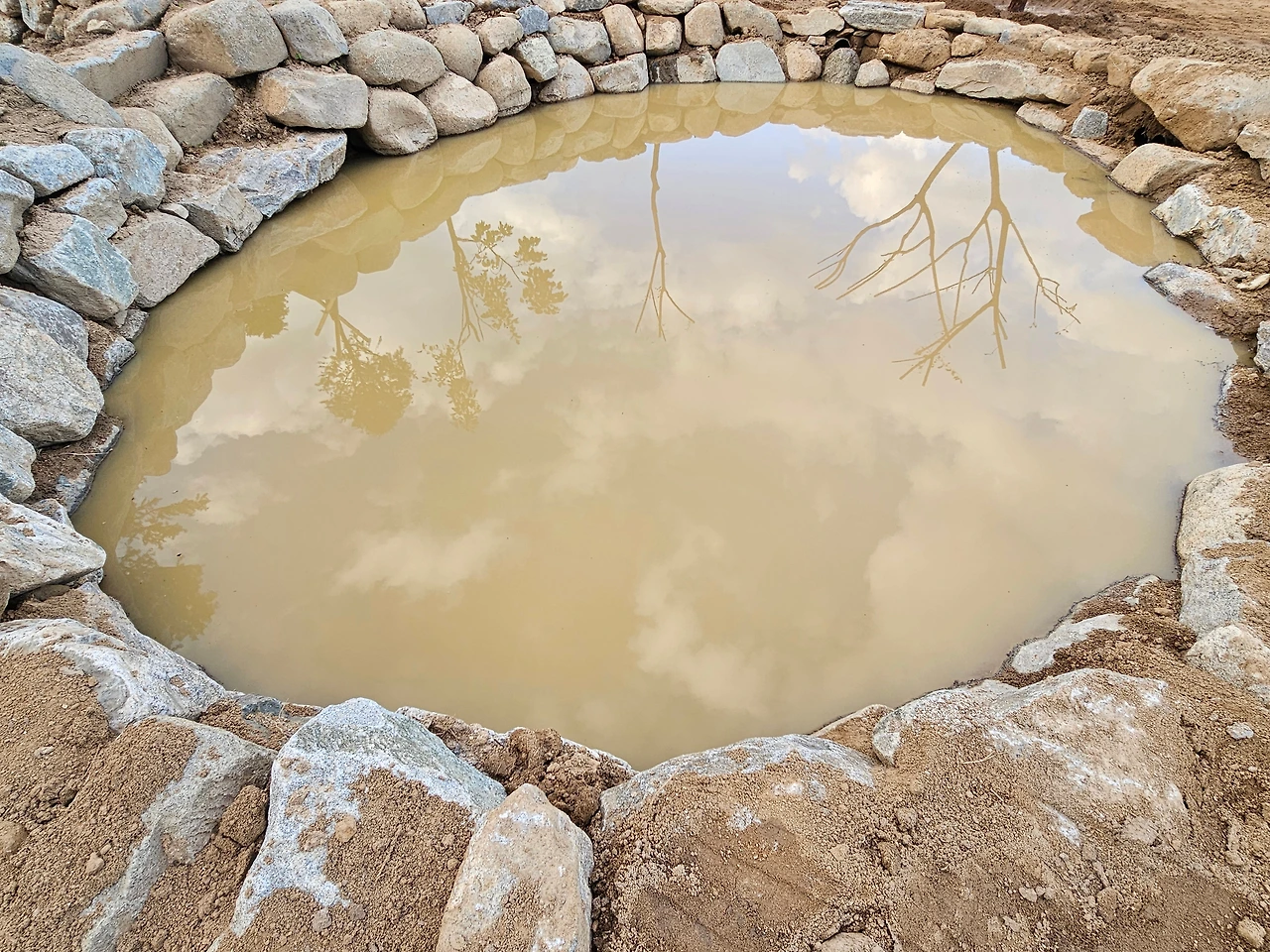 연못을 만들고 있다. 굴착기로 1m쯤 파자 돌멩이 하나 없는 황토층이 나왔다. 습지로 만들려던 계획은 연못으로 바뀌었다. 파낸 흙으로 방수를 하면 물이 새지 않을 것 같았다. 최종 크기 보다 더 크게 팠다. 동그랗게 흙을 파내고 둘레에 돌을 쌓았다. 돌 틈을 황토로 다졌다. 시월의 잦은 비에 빗물을 유입시켰다. 마사가 섞인 토양에 새로 만든 연못이라 물빛이 노랬다. 연못 주위로 주목과 매화나무를 심었다. 설중매가 연못 속에 비치기를 바랐다. 장마라 해도 이상하지 않을 날씨에 작업 능률은 나무늘보가 되었다. 오랜만에 가을 하늘이 열렸다. 흐린 물빛에도 맑은 하늘과 흰 구름은 밝게 담겼다.
