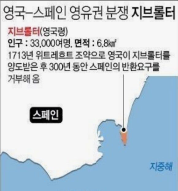 스페인의 남쪽 지방에 있는 "지브롤터"는 스페인 본토에 있는 지방인데도 영국령인 곳, 즉 영국의 식민지다.