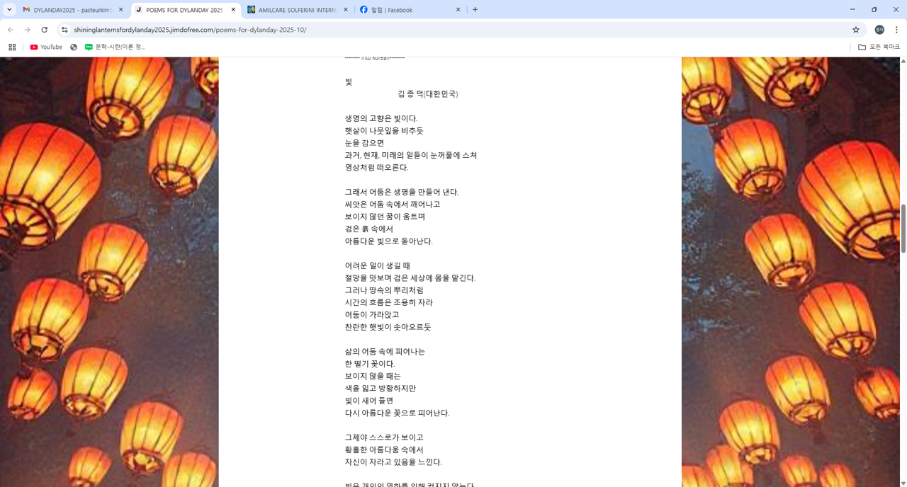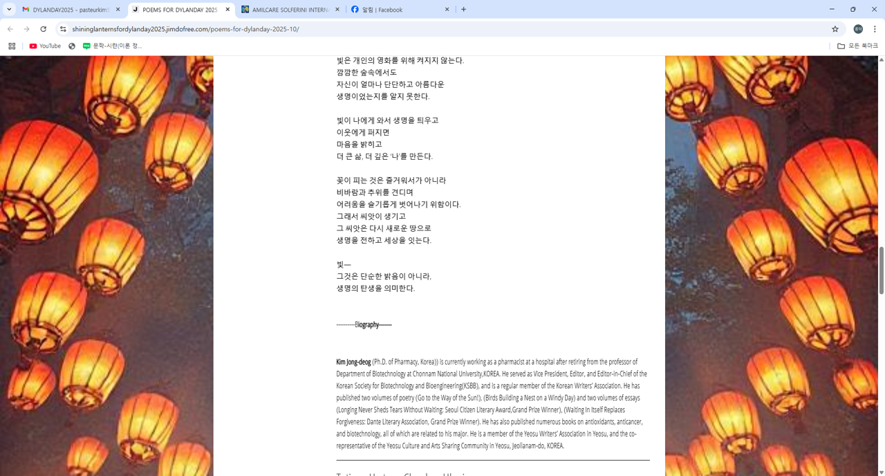 Kim Jong-deog (Ph.D. of Pharmacy, Korea)) is currently working as a pharmacist at a hospital after retiring from the professor of Department of Biotechnology at Chonnam National University,KOREA. He served as Vice President, Editor, and Editor-in-Chief of the Korean Society for Biotechnology and Bioengineering(KSBB), and is a regular member of the Korean Writers’ Association. He has published two volumes of poetry (Go to the Way of the Sun!), (Birds Building a Nest on a Windy Day) and two volumes of essays (Longing Never Sheds Tears Without Waiting: Seoul Citizen Literary Award,Grand Prize Winner), (Waiting In Itself Replaces Forgiveness: Dante Literary Association, Grand Prize Winner). He has also published numerous books on antioxidants, anticancer, and biotechnology, all of which are related to his major. He is a member of the Yeosu Writers’ Association in Yeosu, and the co-representative of the Yeosu Culture and Arts Sharing Community in Yeosu, Jeollanam-do, KOREA.