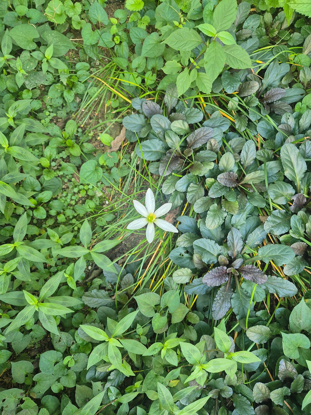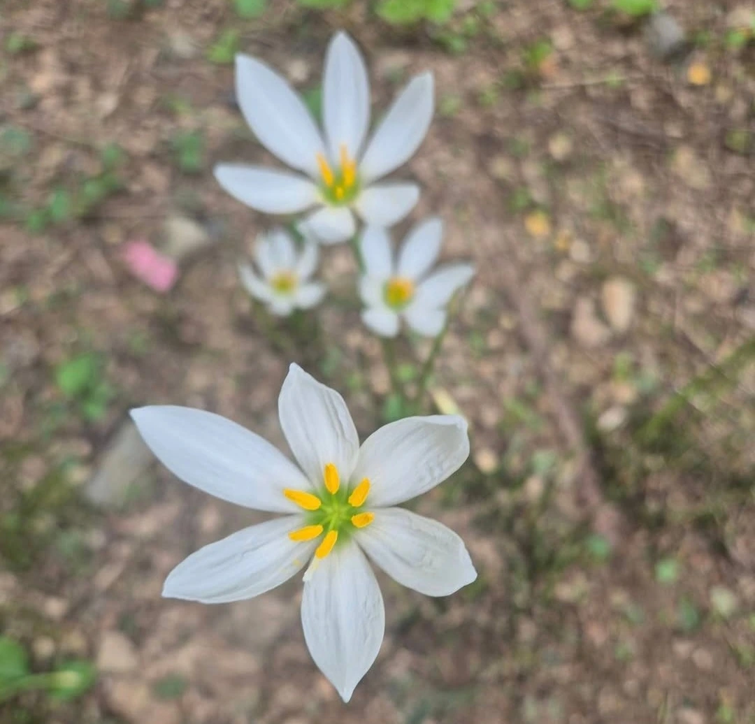 오늘 아침에 집 앞 화단에서 활짝 핀 샤프란꽃(흰꽃나도사프란)을 만났다. 이맘때 이런 무더위 속에서도 이토록 청초할 수 있는가!