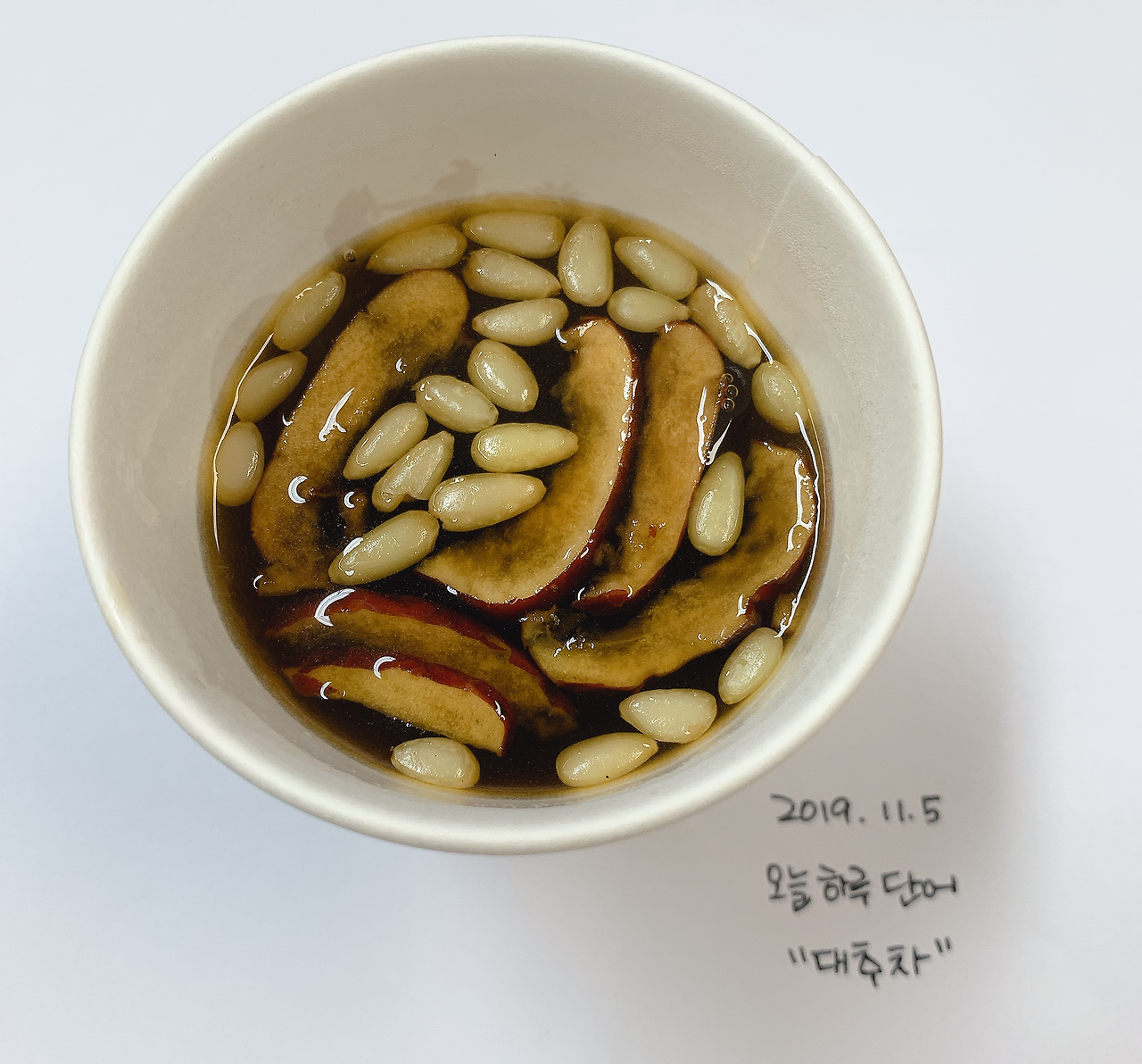 종이컵에 얇게 썰은 대추와 고소한 잣을 듬뿍 넣어주시고는, 진하게 우린 차를 담아주셨다.