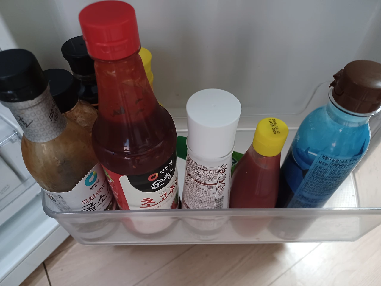 냉장실에는 밑반찬류, 채소와 과일 약간, 양념 및 소스류, 양배추즙과 소면 정도가 있습니다.